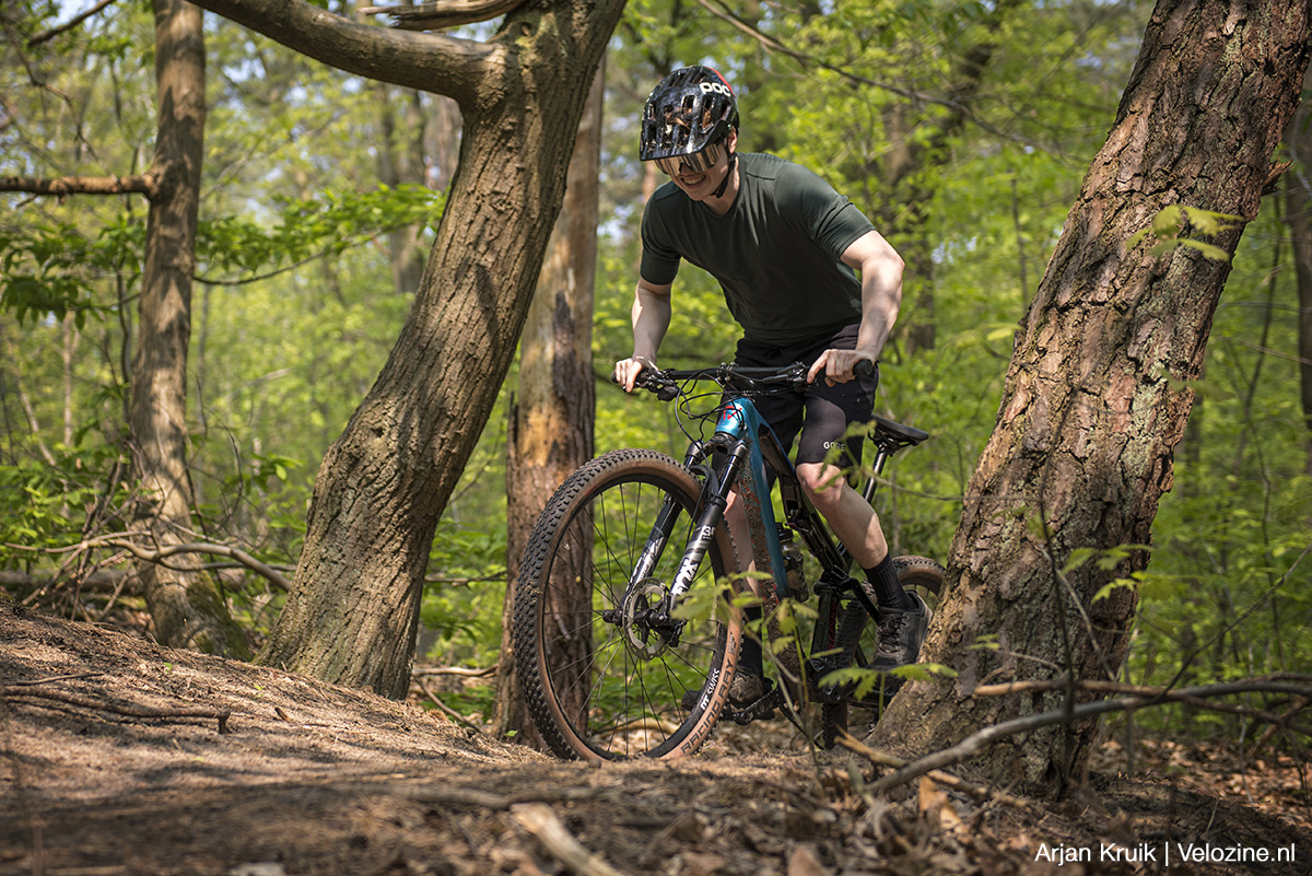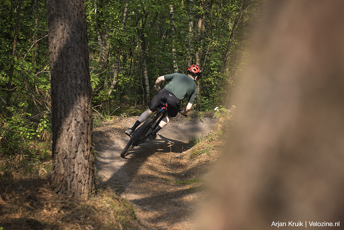 Ook de stuurprecisie is ronduit goed; hier blijkt dat de Fox 34 Step-Cast op het vlak van stijfheid in een heel andere divisie speelt dan de Fox 32 Step-Cast in de Conway RLC FS 6 die we in 2021 testten. Plus: de twee centimeter extra veerweg – en de iets luiere balhoofdbuishoek die dat oplevert – komen op de Heuvelrug veel meer van pas dan op m’n vaste Brabantse rondjes. Als de Heuvelrug jouw habitat is, dan is de 120 millimeter voorvork dus zeker niet misplaatst. M’n indruk dat deze fully zich bovengemiddeld efficiënt omhoog laat peddelen blijft op de Heuvelrug overeind. Wat een klimkoning! En dat met de standaard, relatief zware systeemwielen. Kan je nagaan waartoe deze bike in staat is met een setje lichtgewicht carbon hoepels…