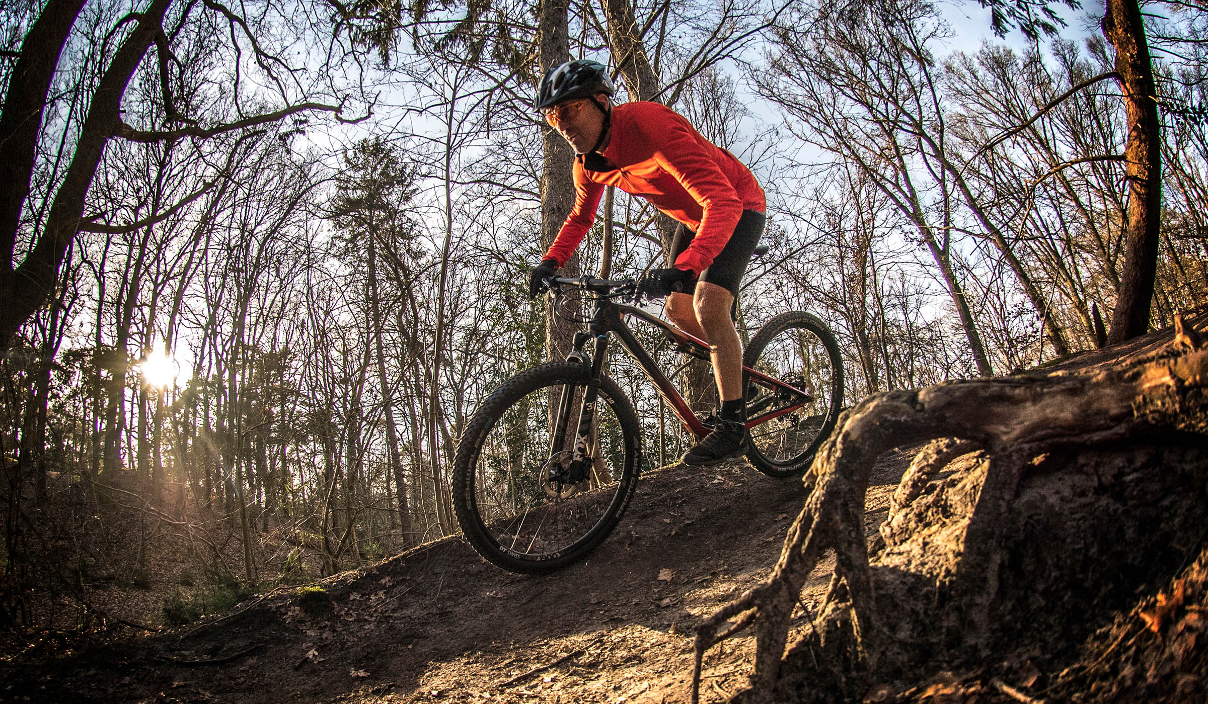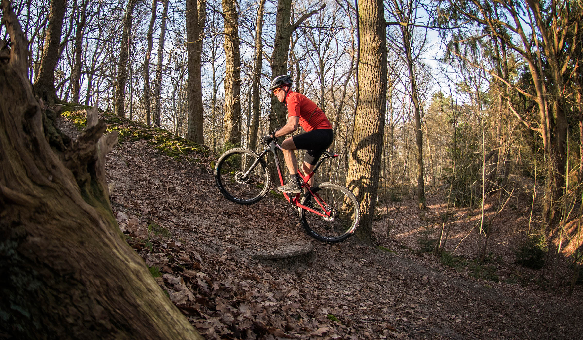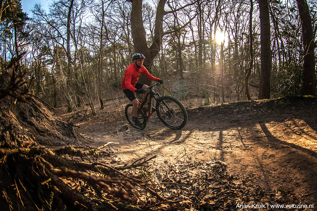 In de relatief lange beklimmingen op deze voormalige vuilnisbelt, die ik grotendeels zittend op het zadel overmeester, blijkt de achtervering nauwelijks gevoelig voor deinen. Inzakken van de achtervering in de steilste secties? Nauwelijks. Het voorwiel blijft bovendien mooi aan de grond, met dank aan de relatief lange achterbrug en de korte balhoofdbuis. Zelfs in de korte maar steile klimmetjes in de aansluitende route door bos, die ik wel voornamelijk staand in de pedalen neem, houdt de achtervering zich prettig koest. Het is een afgekloven cliché, maar door z’n directheid en sportiviteit waan ik me op de Conway RLC FS echt de King of the Kragge!