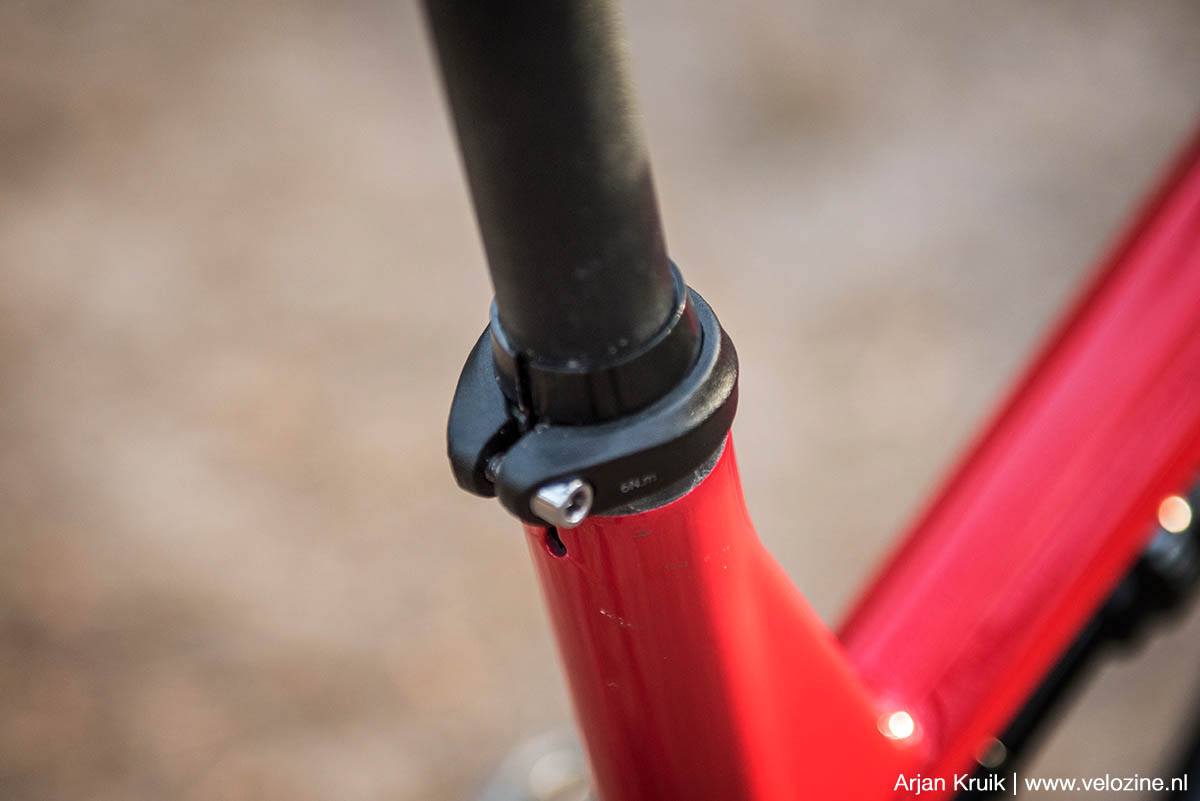 Het frame RLC FS 6 ziet er strak uit. Over de knik in de bovenbuis is niet iedereen even enthousiast, maar ik vind het eigenlijk wel dynamisch ogen. Bovendien staan hierdoor de achterbrug en de bovenbuis mooi in elkaars verlengde, zonder dat dit een te hoge balhoofdbuis of een te kleine voordriehoek oplevert. Er is nu in de voordriehoek namelijk plek voor twee bidons; een kleintje op de zitbuis en een grote op de onderbuis. Alle kabels lopen strak binnendoor, met praktische kabelpoorten links en rechts van de balhoofdbuis, inclusief een extra doorgang voor een de kabel van eventuele verstelbare zadelpen. Conway heeft overigens geen enkele RLC FS met dropper-post in z’n collectie, maar het rechte stuk van de zitbuis is diep genoeg voor een dropper met 15 centimeter verstelbereik.