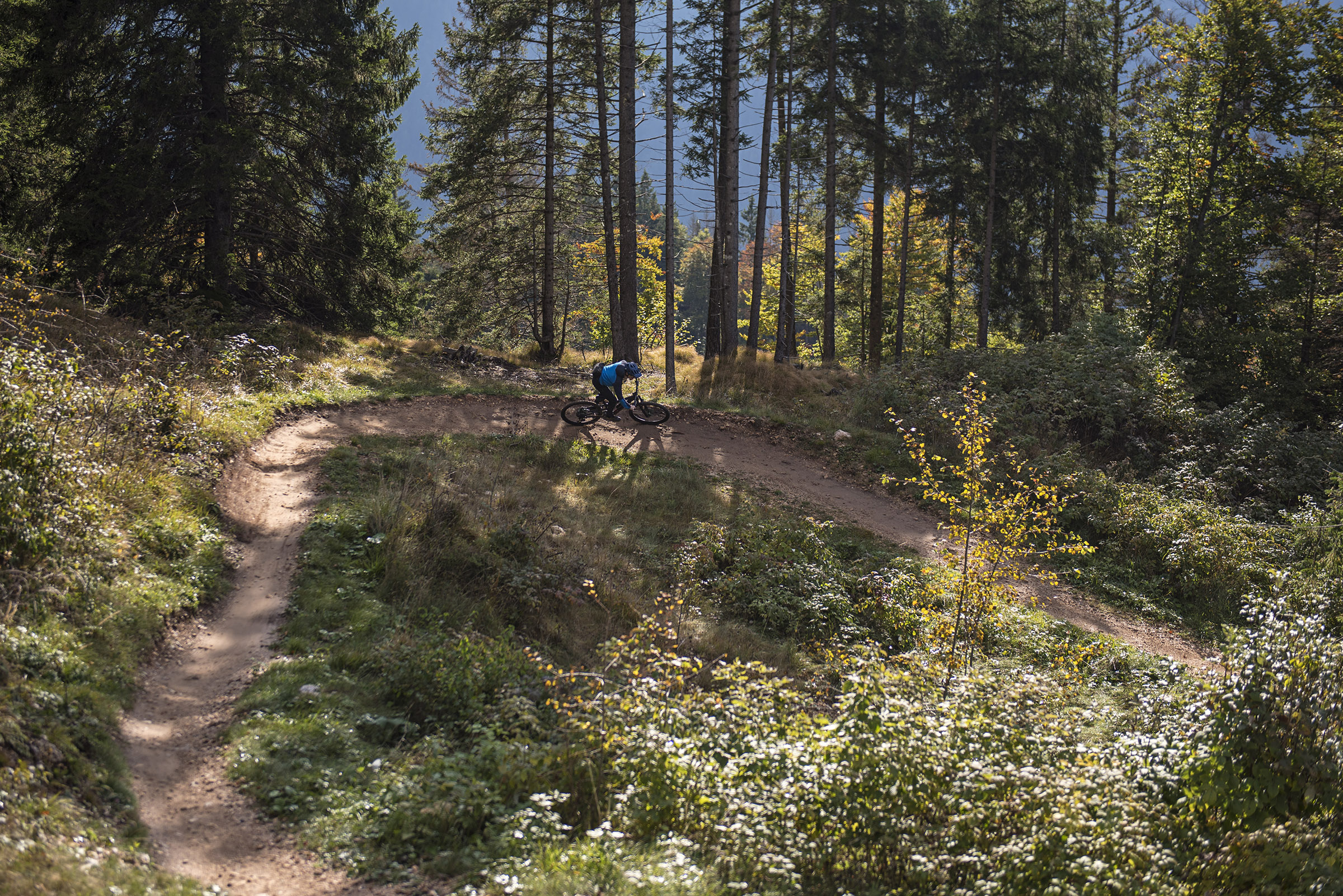 Eenmaal boven heb je de motor en accu eigenlijk niet meer nodig. En dan is het fijn dat ze ook niet zoveel wegen. Op de flowtrails van Dolomiti Paganella is de Conway ST in z’n element. Snel, controleerbaar en levendig. Alhoewel lichtere wielen en banden op dit soort paden zeker toegevoegde waarde zouden hebben, ben ik blij dat de Ryvon niet op lichtgewicht rubbers staat. Want naast relatief makkelijke flowtrails ligt Dolomiti Paganella ook bezaaid met steile en ruige sentieri. En die stellen veel hogere eisen aan zowel de rijder als de bike.