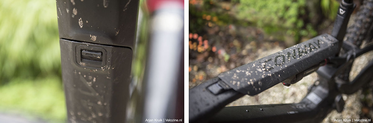 Desalniettemin: mocht je de Ryvon ST 4.0 nét zo licht afmonteren, dan nóg zal de Conway niet zo licht worden als de KTM Macina Scarp en de Cube AMS Hybrid. Dat komt omdat Conway heeft gekozen voor een frame met een accu die via een klep in de onderbuis uitneembaar is. En zo’n constructie is per definitie zwaarder dan een frame met volledig geïntegreerde, niet uitneembare accu. Dit is overigens geen sléchte keuze – een uitneembare accu heeft absoluut voordelen, daarover meer onder het kopje ’trapondersteuning’ – maar je moet wel wat extra grammen op de koop toe nemen.
