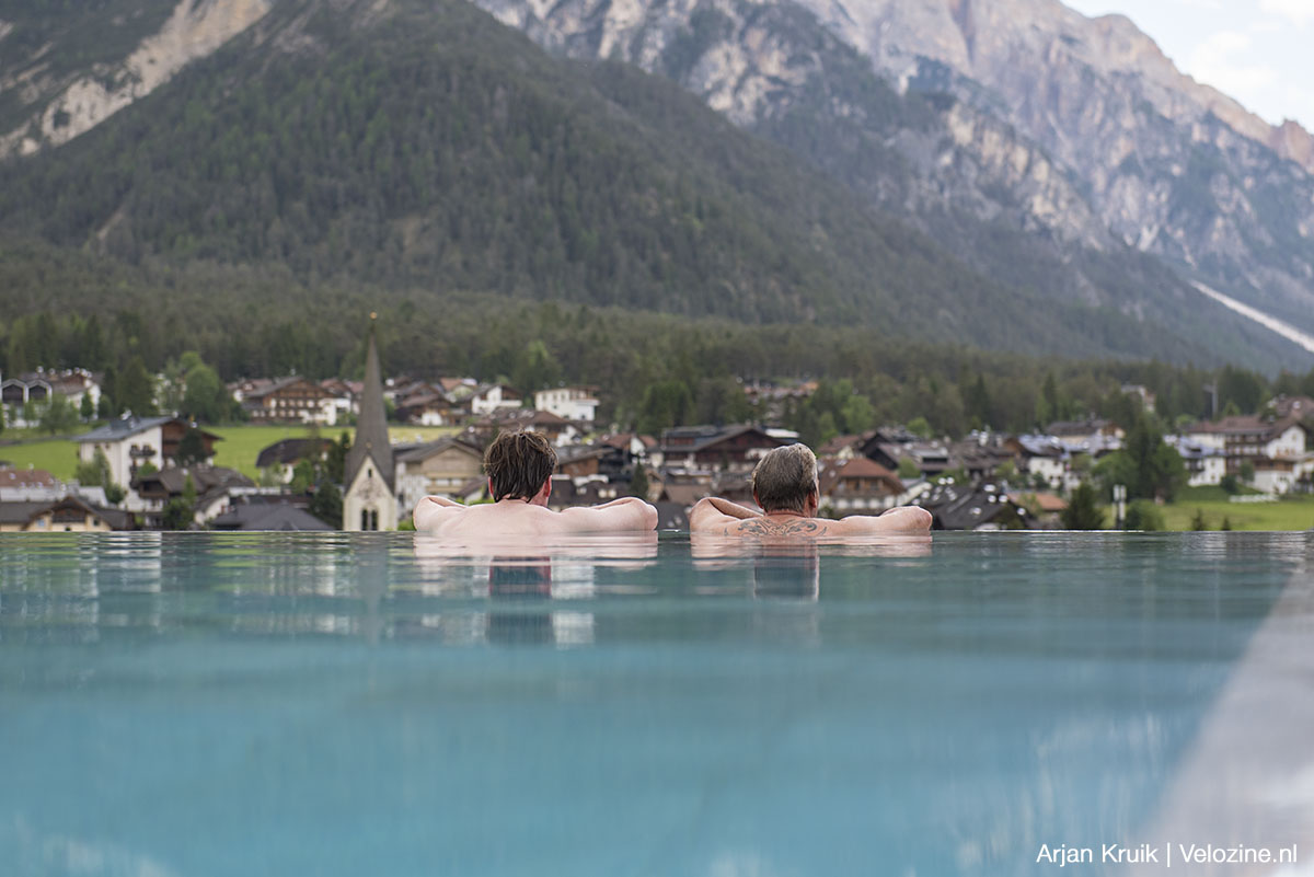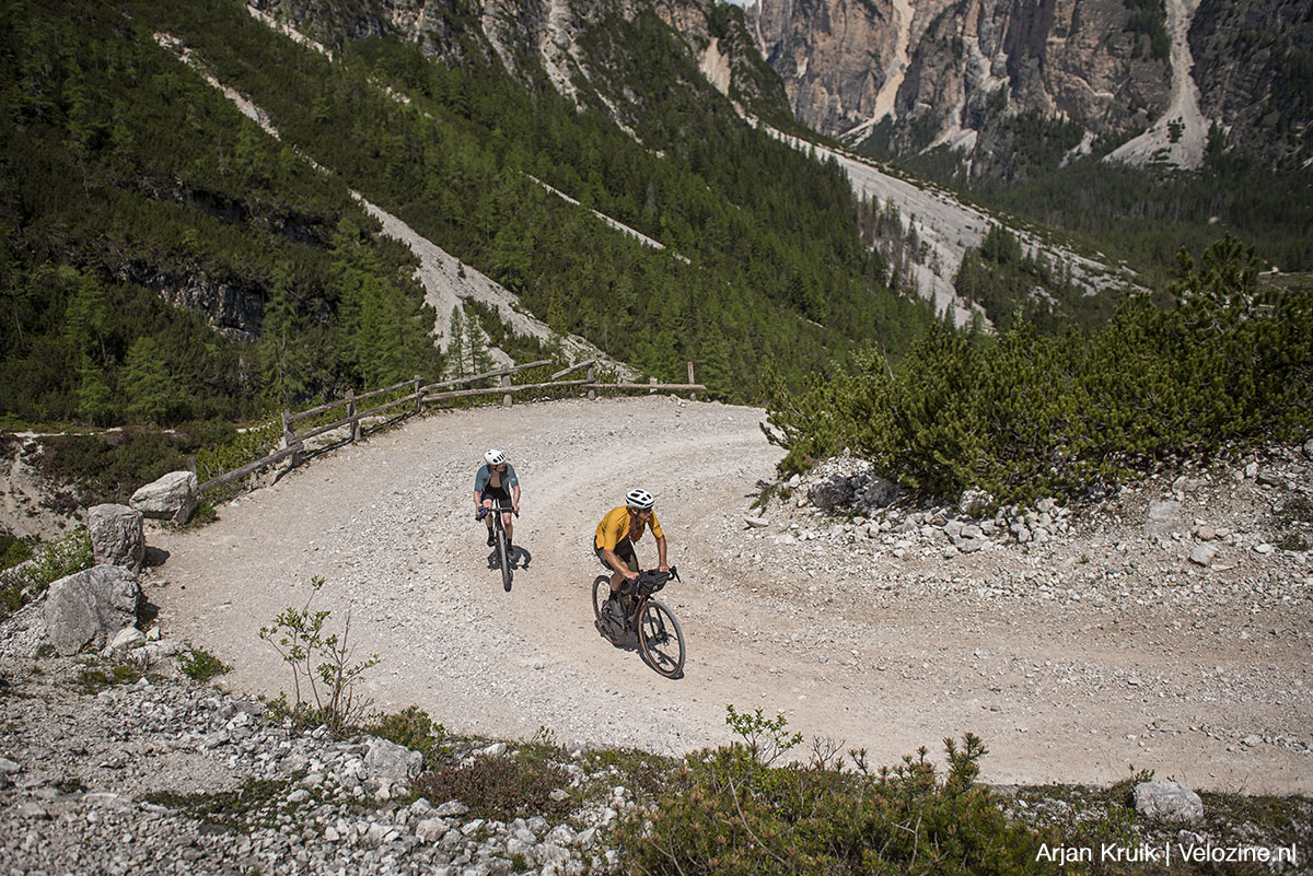 Niet dat ik niet nóg lichter zou willen. Als de gravelweg die ons naar het Fanes-plateau moet brengen de vijftien procent royaal begint te overstijgen, is het toch nog aanpoten geblazen. Met z’n 85 kilo zit Mark zelfs stevig in het rood. Alhoewel hij een paar weken eerder nog Parijs-Roubaix heeft gereden, is dit voor hem nét even te steil. Een nóg kleiner voorblad monteren? Zeker niet cool, maar voor tochten als deze zou ik het waarschijnlijk wel doen.