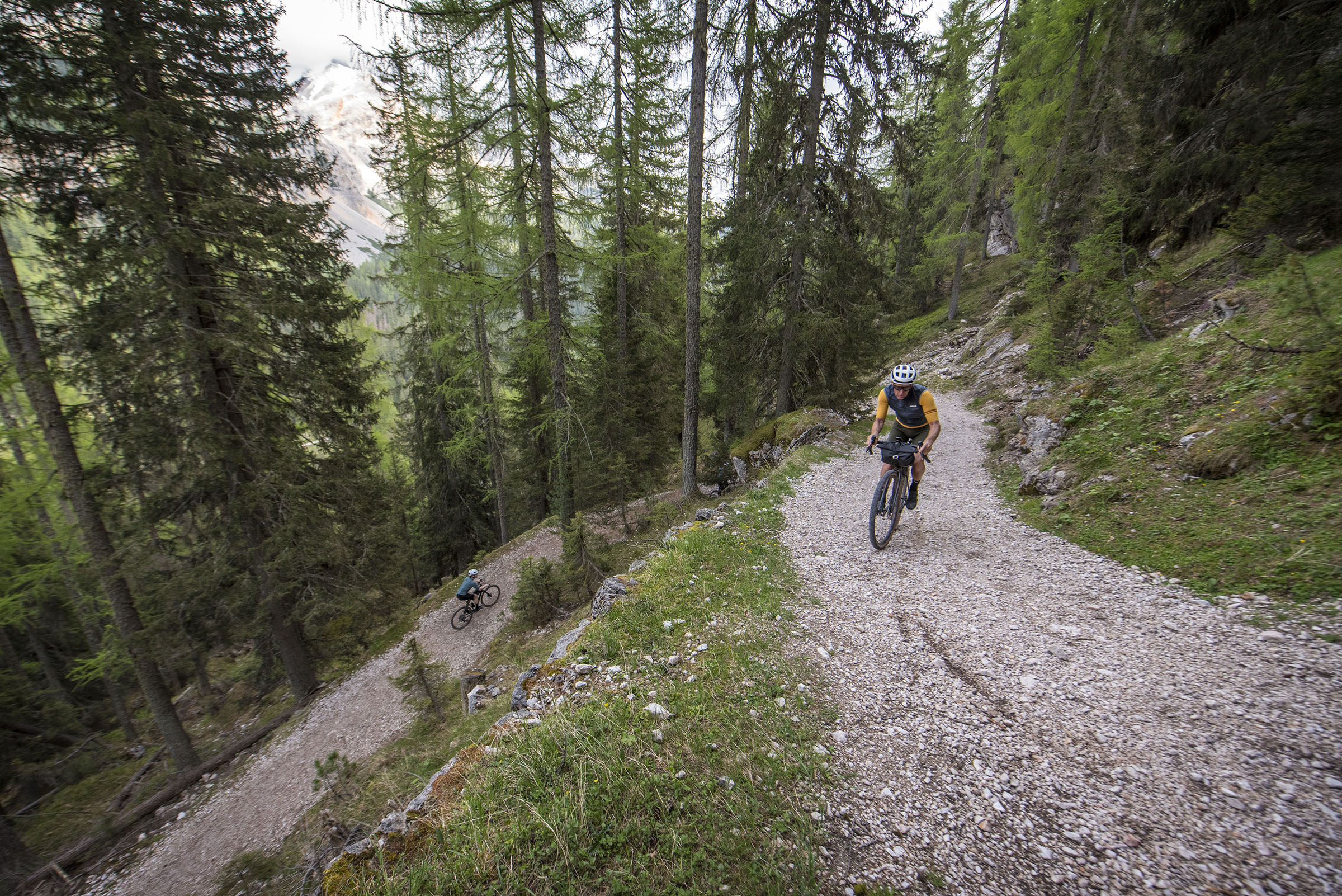 Over steil gesproken: tijdens de tweede en laatste lange klim van de Fanes-ronde, in een sectie met een stijgingspercentage van meer dan twintig procent, blijkt niet alleen dat het lichtste verzet tóch nog iets lichter had gemogen, maar ook dat de achterband tegen z’n grenzen aanloopt. Het blijkt lastig om de balans te vinden tussen enerzijds het rondkrijgen van de pedalen en anderzijds het houden van grip op de losse ondergrond. Met name Mark, die veel meer vermogen kan wegtrappen dan ik, slipt bij hard aanzetten regelmatig door, met stilvallen tot gevolg. Een bredere band met een lagere luchtdruk zou op dit vlak verbetering brengen. In frame en vork past 50 millimeter brede banden. En in de Dolomieten zijn zulke brede rubbers zeker niet overdreven.