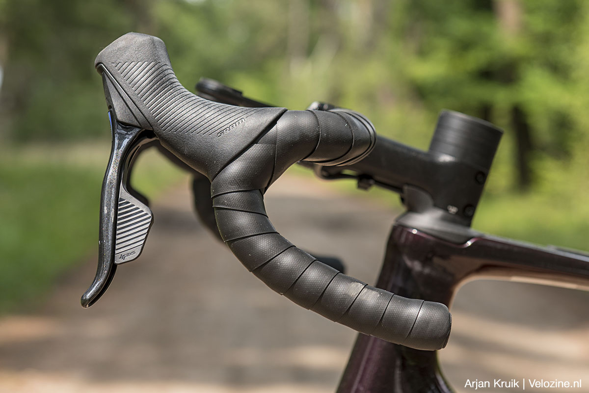 Puntje van aandacht: vanwege de scherpe, ondiepe stuurbocht is het redelijk lastig om de remgrepen op exact de juiste plek te plaatsen. Ze zitten al snel te hoog of juist te laag. In het eerste geval kom je met je handen in de beugels minder goed bij de remgrepen, in het tweede geval valt de zit iets dieper en gestrekter uit dan je misschien zou willen. Het is een probleem waar ik wel vaker tegenaan loop. Hoewel ik dit type compacte gravelstuur doorgaans prettig vind rijden, is de combinatie met sommige remgrepen niet altijd perfect.
