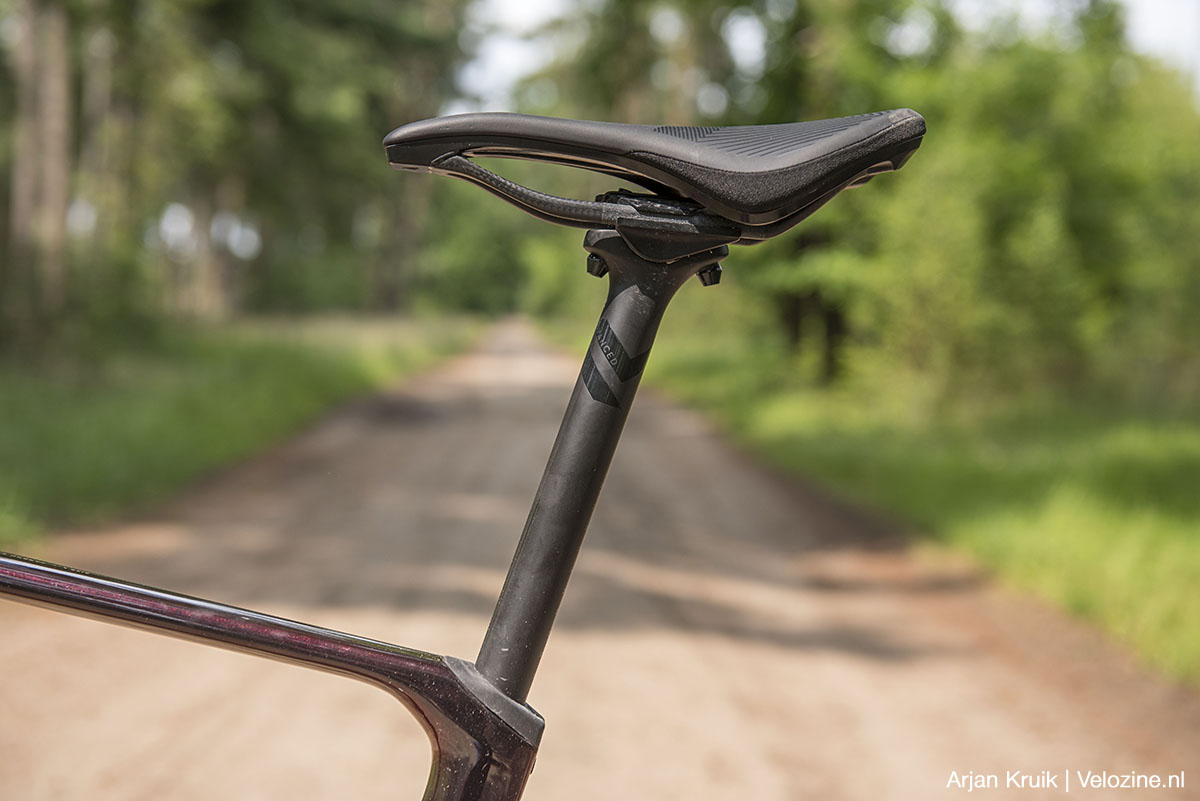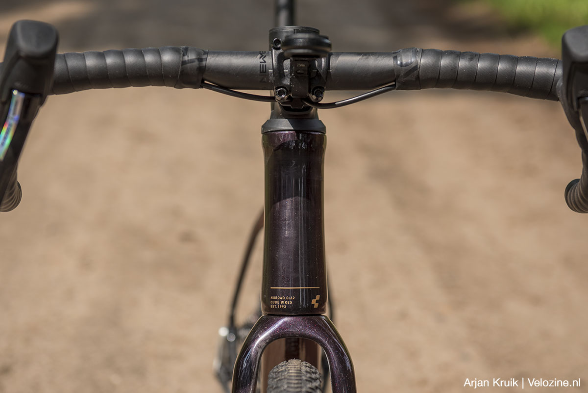 Het carbon frame van de Cube Nuroad C:62 beschikt niet over een comfortverhogend veersysteem zoals Treks Isospeed of de Future Shock van Specialized. In plaats daarvan kiest Cube voor een constructieve benadering die inmiddels gemeengoed is: een slanke staande achtervork die laag op de zitbuis aansluit. Hoewel deze oplossing in theorie kán bijdragen aan het rijcomfort, is dat – zo is mijn ervaring – niet altijd het geval. De geïntegreerde zadelpenklem biedt die garantie wel; doordat er extra veel zadelpen boven het frame uitsteekt, is deze beter in staat klappen op te vangen. En al helemaal als de zadelpen van carbon is, zoals op de testfiets.