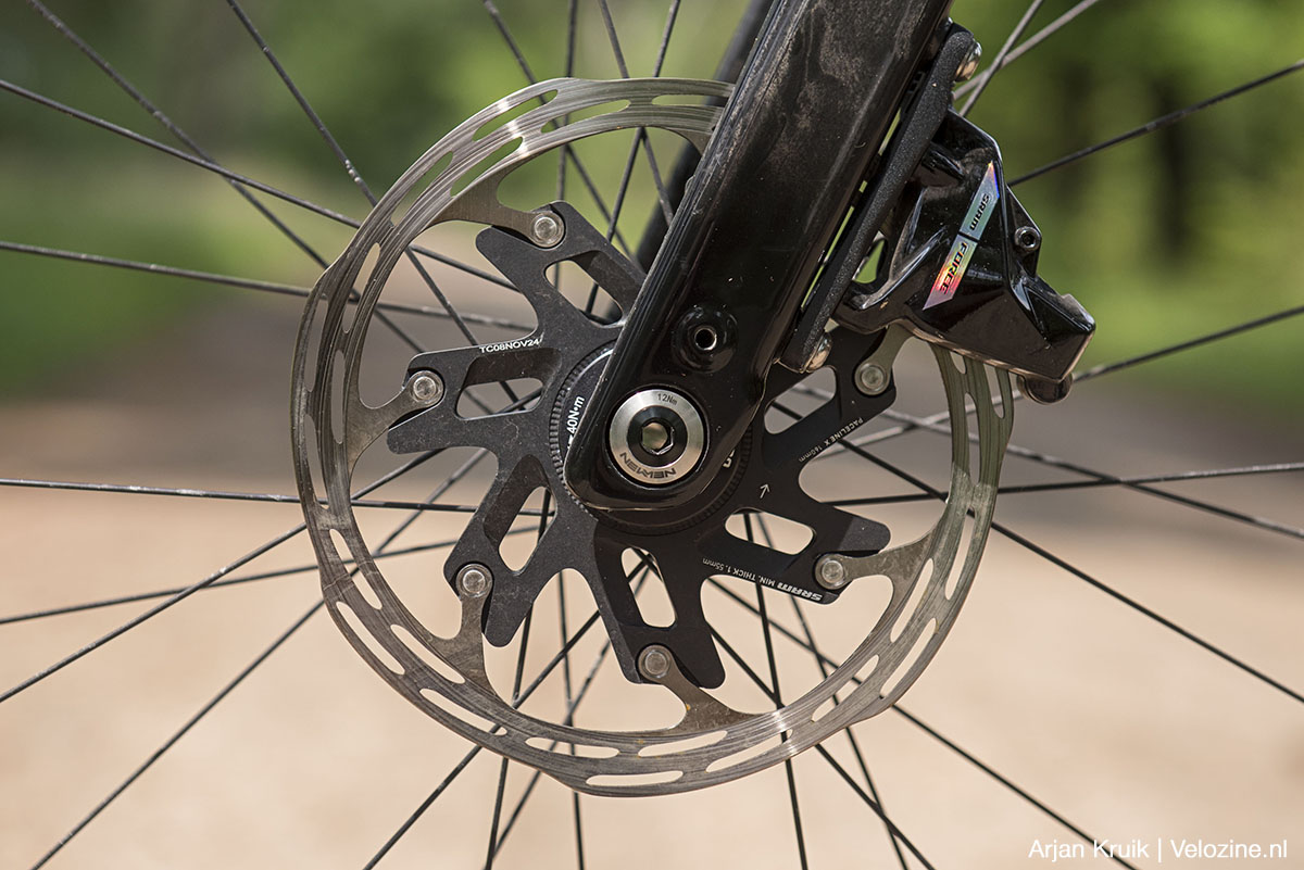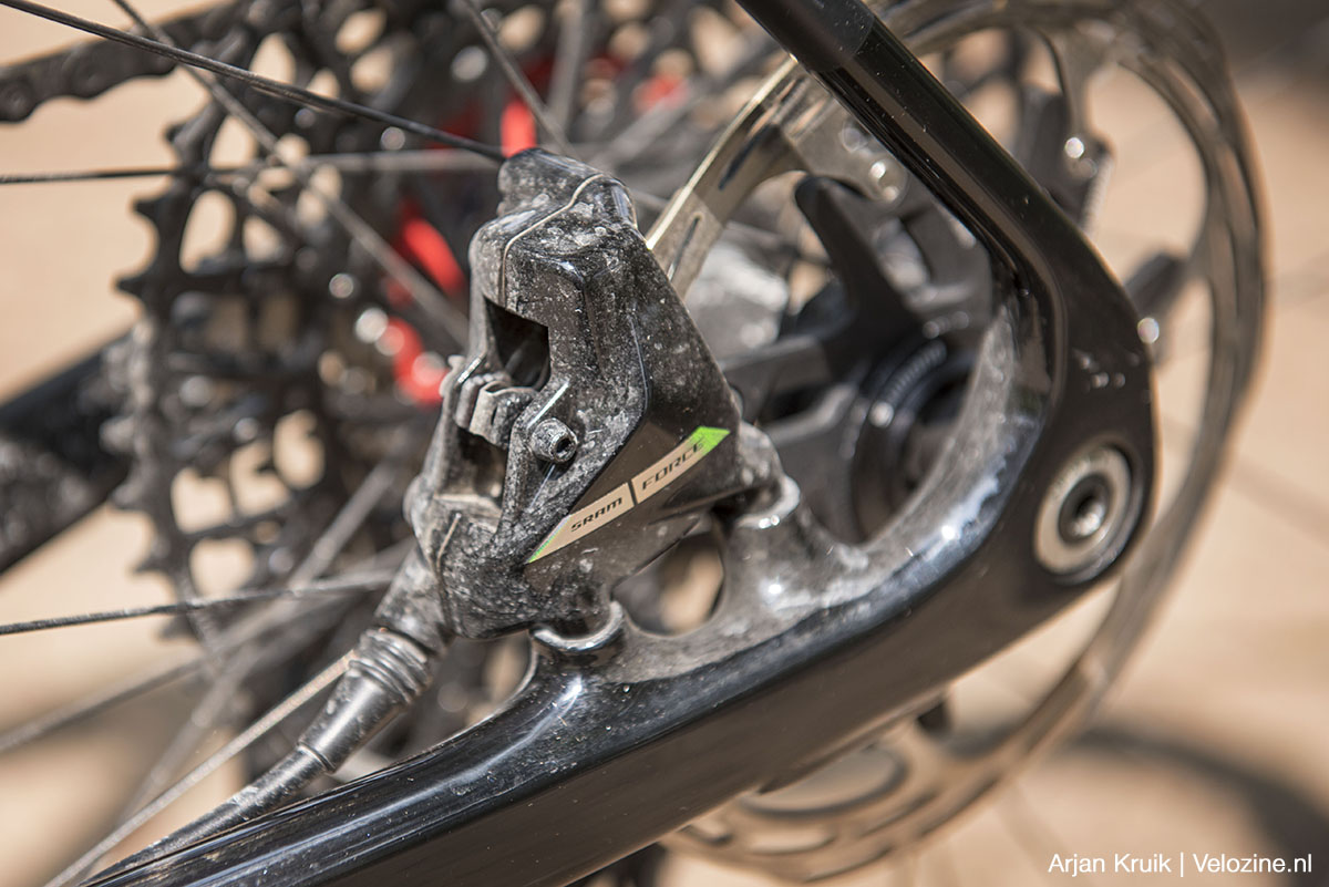 De remmen, remhendels en verstellers komen uit Srams Force-groep. De stoppers beschikken over veel remkracht en zijn goed doseerbaar. Met één vinger remmen? Kan gewoon, ondanks de relatief geringe afmeting van de remschijven: 160 millimeter rondom, ook bij Marks maat L. De warmteafvoer van die kleine schijfjes is overigens verrassend goed, op beide testbikes laten de schijven geen tekenen van oververhitting zien. Maar wat je wél ziet is een snelle slijtage van zowel de schijven als de remblokjes, met name op Marks Nuroad, die ruim vijftien kilo meer weegt dan ik. Oké, we hebben regelmatig regen gehad tijdens onze ritten en natte gravel is zeker een brake-killer. Maar dan nog; met grotere remschijven zou de slijtage absoluut geringer zijn geweest.