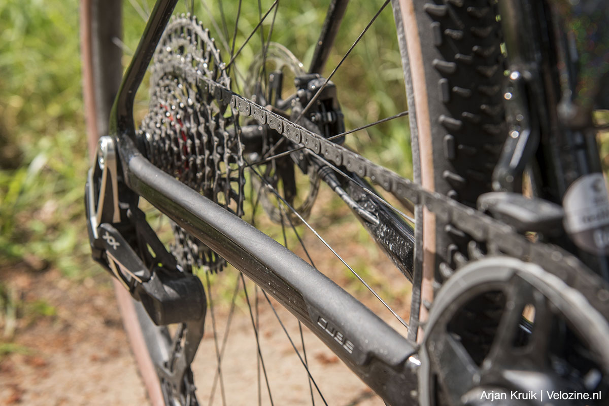 Je leest vaak dat de gravelbike een baby is van een racefiets en een mountainbike. En als je de aandrijving bekijkt die Cube aan de Nuroad C:62 SLX heeft gehangen, dan lijkt die uitspraak op waarheid te berusten. Achteraan vind je namelijk mountainbikespul, terwijl aan de voorkant juist racefietsonderdelen zitten. Concreet: derailleur, cassette en ketting zijn afkomstig uit Srams XX SL Eagle AXS Transmission-mountainbikegroep, cranks, voorblad en shifter heeft Cube uit de racefietsgroep Force getrokken. De huidige groep, niet de nieuwe die Sram recentelijk heeft gepresenteerd.