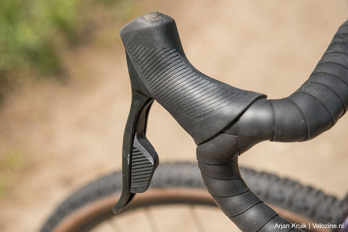 Ander puntje van aandacht: de vorm van de remhendels is niet mijn ding. Dat wil zeggen, met de handen bovenop de remgrepen. Ik vind de ergonomie minder prettig dan bij de evenknieën van Shimano. Met de handen onderin de beugels is de ergonomie overigens wel gewoon goed.