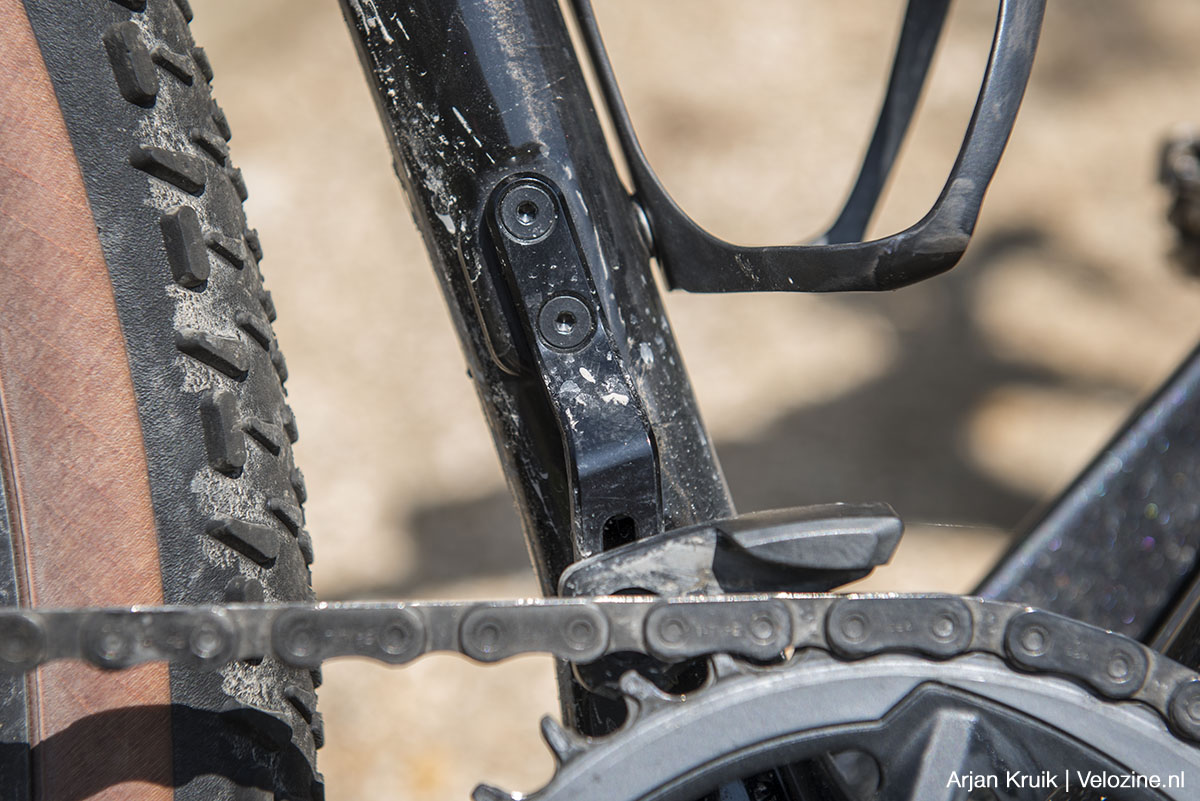 De kabelvoering is strak uitgevoerd. Slechts twee leidingen – beide voor de hydraulische schijfremmen – verdwijnen via het bovenste balhoofdlager in het frame. Schakelbekabeling ontbreekt, want de gemonteerde Sram XX SL Eagle AXS Transmission-groep werkt volledig draadloos. Deze 12-speed aandrijflijn maakt gebruik van Srams robuuste full-mount-derailleurtechniek, waarvoor het frame is voorzien van UDH-achterpatten. Wie liever met Shimano schakelt, komt eveneens aan z’n trekken. Het frame is voorbereid op Di2: onder de trapas is ruimte voor de bijbehorende batterij. Daarnaast maakt het montagepunt op de zitbuis het monteren van een voorderailleur mogelijk, zodat ook een dubbel crankstel tot de opties behoort.