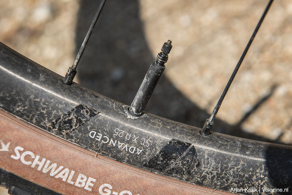 Alhoewel in het frame banden tot 50 millimeter breed passen, kiest Cube bij de Nuroad C:62 SLX in de vorm van de G-One RX Pro voor 45 millimeter. Op zich prima; deze nieuwe gravelband van Schwalbe is ondanks z’n ogenschijnlijke grove noppenprofiel zeer allround. Wil je er het fijne van weten, lees dan even de test van de G-One RX Pro die collega Jeroen schreef. Maar als de Nuroad C:62 SLX mijn eigen gravebike was, dan zou ik voor een tocht door de Dolomieten toch een maatje breder omleggen, voor meer tractie, grip, controle en comfort.
