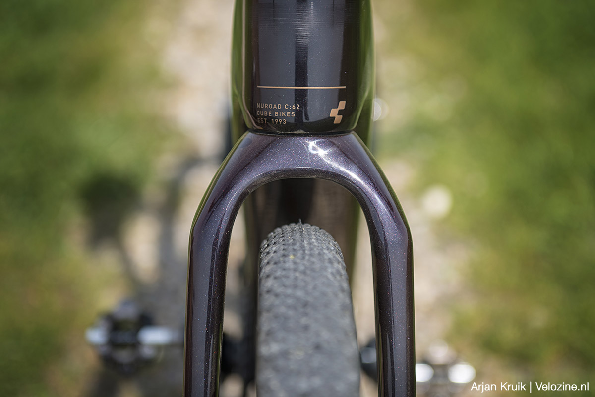 Onze testfiets in maat M weegt 12,9 kilo, inclusief motor en accu. Dat is licht voor een gravelbike met trapondersteuning. Maar bedenk wel dat onze testfiets, de Nuroad Hybrid SLT, de duurste uitvoering is, met een keur aan lichtgewicht onderdelen. Aan de andere kant, het goedkoopste model, de Nuroad Hybrid Race, weegt met 14,3 kilo niet héél veel meer. Naast de lichte Bosch SX-motor en dito accu – waarover straks meer – komt een belangrijk deel van dat lage gewicht op het conto van het frame. Dat is gemaakt van Cube’s hoogwaardige C:62-carbon en weegt volgens de Duitse fabrikant inclusief de vork nog geen 2 kilo. Niet superlicht voor een reguliere gravelbike van carbon, maar wel voor een exemplaar dat een motor en een accu moet huisvesten.
