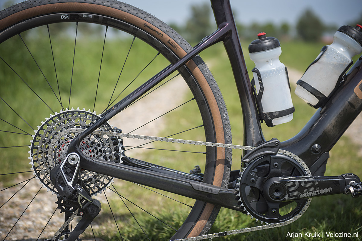 Nog even over Bosch SX versus CX: de Q-factor van de SX-motor is met 160 millimeter fors kleiner en ook de trapweerstand en het geluidsniveau zijn minder. De bediening van de SX-motor daarentegen wijkt niet af van die van CX-modellen: een in de bovenbuis geïntegreerde display, de twee knoppen voor de bediening op het stuur. Ook de ondersteuningsstanden zijn nagenoeg hetzelfde: eco, tour+, sprint en turbo. Alleen de sprint-stand is nieuw in dit rijtje. Het is de gravel-equivalent van de e-mtb-stand, met een dynamische ondersteuning tot 280 procent van je eigen kracht. De mate van ondersteuning is in deze modus dus deels afhankelijk is van de kracht die je zelf levert. Anders gezegd: hoe meer je vraagt, hoe meer de Bosch SX-motor levert. Dat geeft een veel natuurlijker rijgevoel dan niet dynamische ondersteuning.