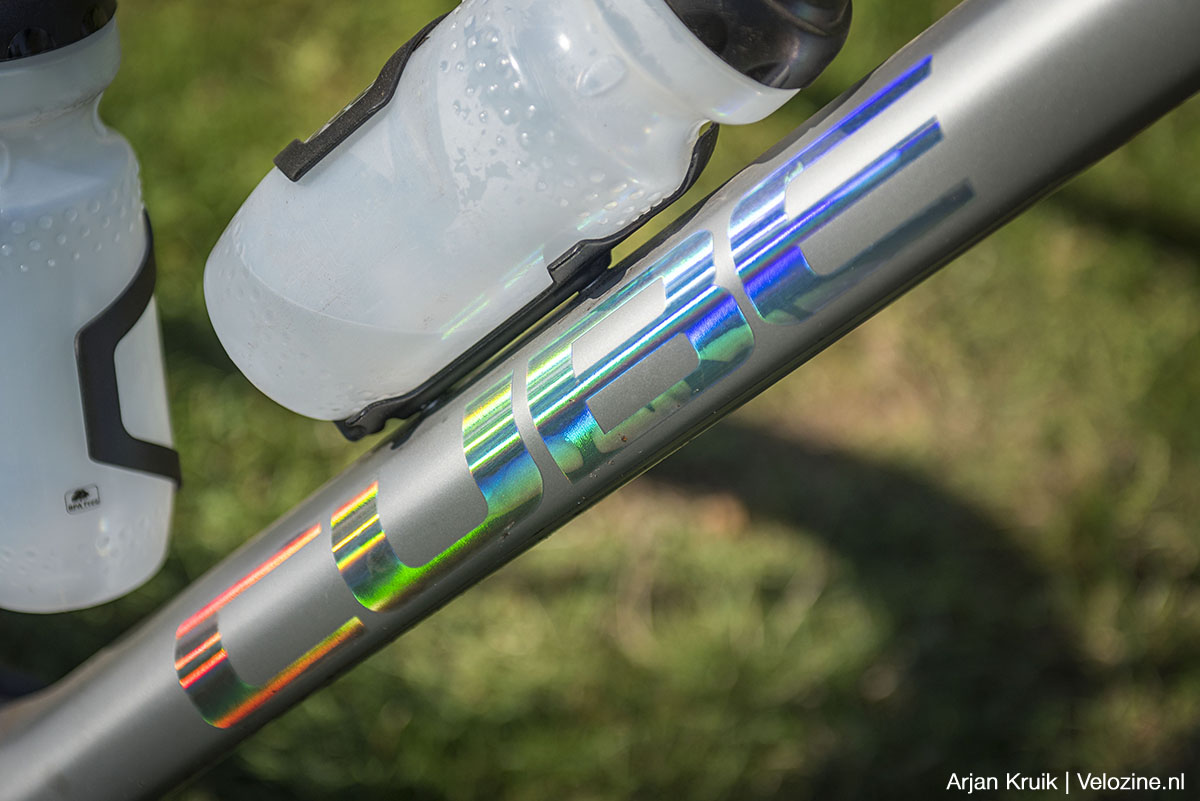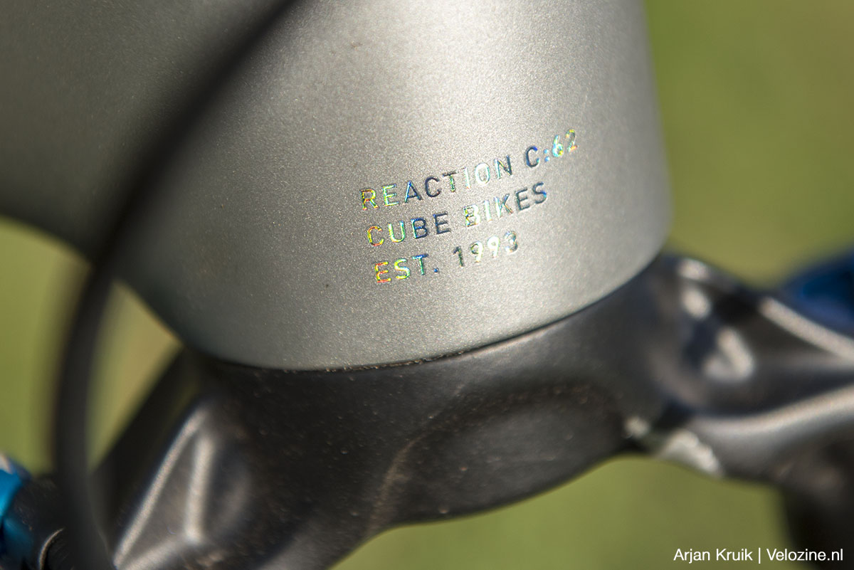 Een paar dingen vallen op als je de Cube Reaction C:62 voor het eerst ziet. Allereerst natuurlijk de belettering in fraaie regenboogkleuren. Tenminste, als de zon schijnt. Anders zijn de decals gewoon zilver. En dan de zadelpenklem. Of beter gezegd: het ogenschijnlijke ontbreken daarvan. Pas bij een tweede blik zie je dat het klemmechanisme is weggewerkt in de zitbuis. Deze constructie zorgt ervoor dat er meer zadelpen boven het frame uitsteekt. Daardoor kan deze pen bij schokken makkelijker naar achteren buigen, wat het comfort zou moeten verhogen. De geïntegreerde klem is overigens niet de enige comforttruc: ook de slanke staande achtervork en de onderaan afgeplatte zitbuis zijn ontworpen om de zitbuis (en dus de zadelpen) enigszins naar achteren te kunnen laten buigen.