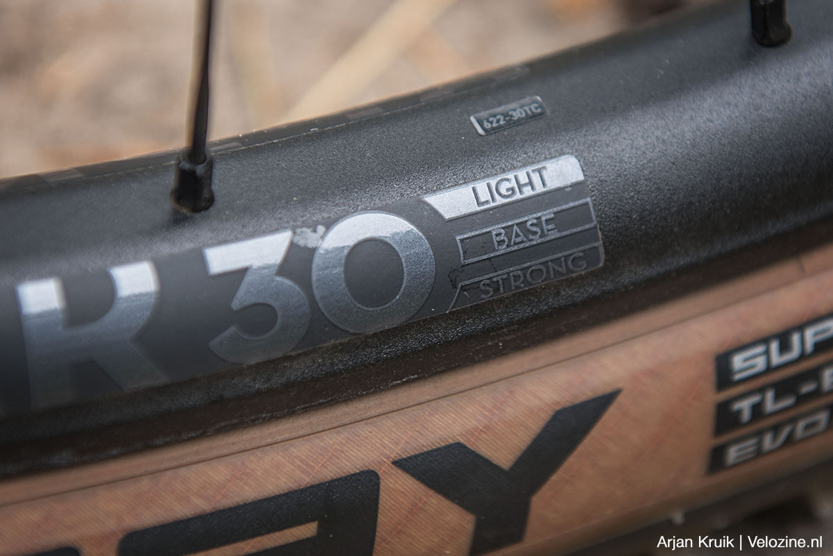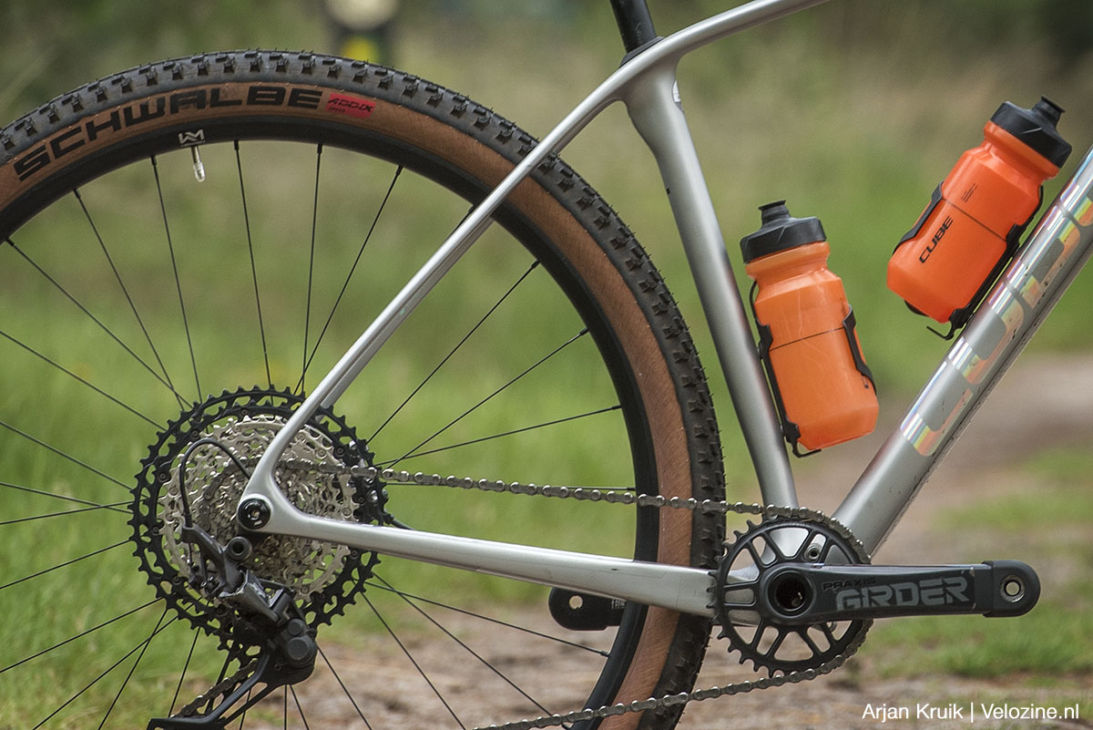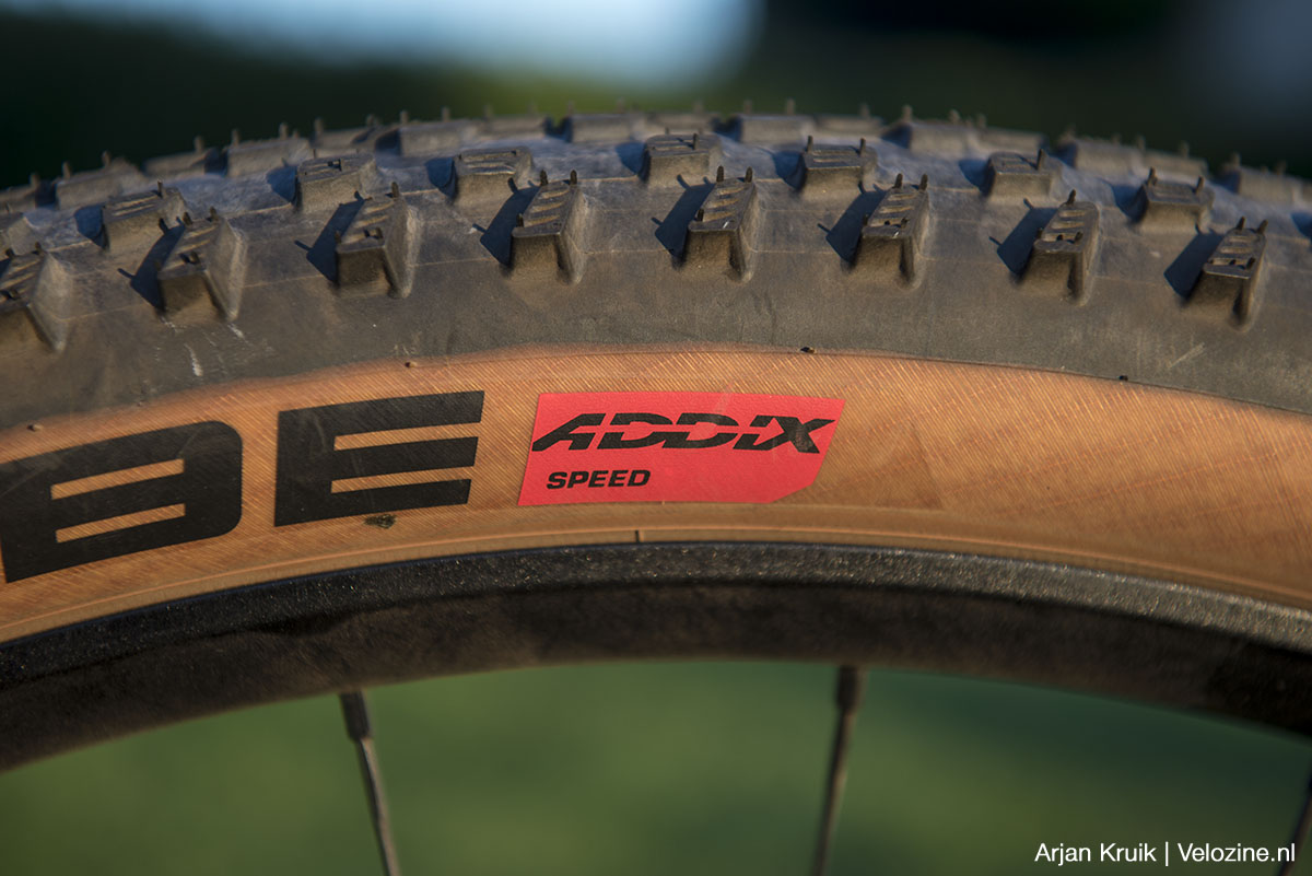 Het rubber van dienst is het populaire Schwalbe-duo Racing Ray en Ralph. Het betreft de uitvoering met Race-karkas en Speed-rubber. Dus Schwalbe’s lichtste karkas en snelste compound. Ik snap de gedachte achter die 2.25’s – je bespaart daarmee per band al snel zo’n zestig à zeventig gram ten opzichte van een 2.35 inch exemplaar en dankzij de brede velgen vallen ze toch behoorlijk volumineus – maar omwille van de grip en vooral het comfort zou ik persoonlijk toch voor een set bredere banden zijn gegaan.