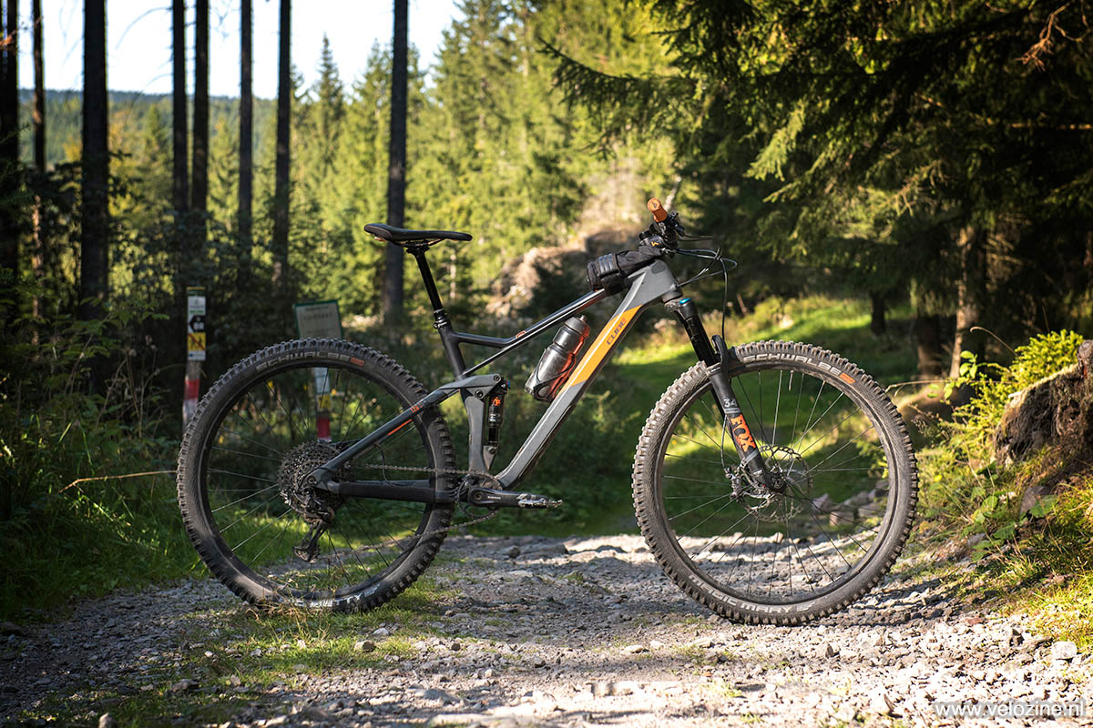 Stereo is de verzamelnaam die Cube gebruikt voor zijn dubbelgeveerde toer-, trail- en enduro-fullies, met veerwegen van 120 tot 170 mm veerweg. Zeg maar de wat ‘dikkere’ bikes uit de Cube-collectie, waaruit ik Stereo 120 HPC TM 29 mee heb gereden. De minst ‘dikke’, zo je wilt. De basis van deze fiets is een strak uitgevoerde carbon voordriehoek (HPC) met aluminium achterbrug. Het geheel wordt gedragen door een Fox-onderstel met 130 mm veerweg aan de voorkant en achteraan een centimeter minder.
