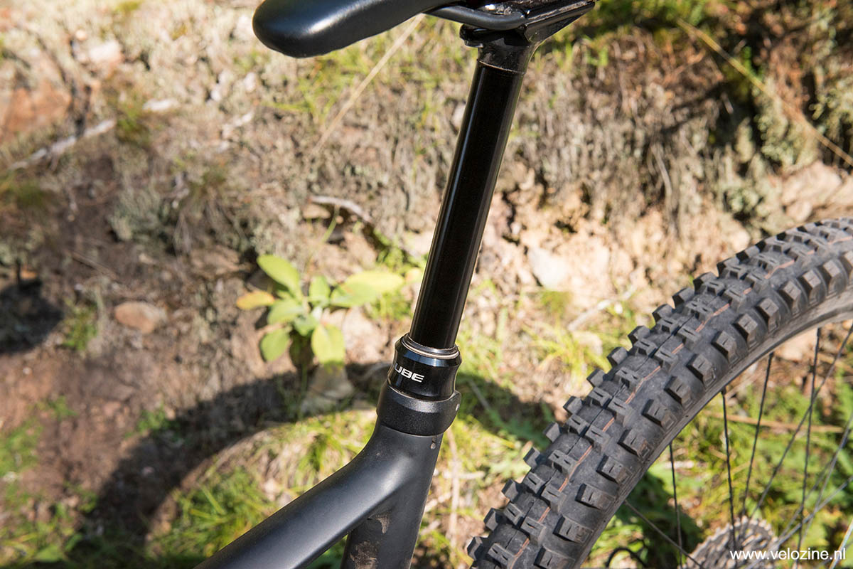 Deze nieuwe Cube Stereo HPC 120 is beduidend langer, luier en lager dan z’n voorganger. Bij mijn 20 inch testbike betekent dat een wielbasis van 119 cm, een zitbuishoek van 75 graden en een balhoofdbuishoek van 67 graden. De ‘reach’ groeide bijna anderhalve centimeter, tot 460 mm. De achterbrug is ook iets langer dan bij de vorige uitvoering: 435 mm in plaats van 428 mm. De zitbuis, tot slot, meet 47 cm. De officiële frame-maat (20”/50,8 cm) komt dus niet overeen met de feitelijke lengte van de zitbuis (18,5”/47 cm). Een beetje verwarrend, maar op zich niet erg. Eerder een voordeel. Een zitbuis van ruim 50 cm zou niet werken met een dropper-post van 15 cm; het zadel zou dan voor mij te hoog komen.