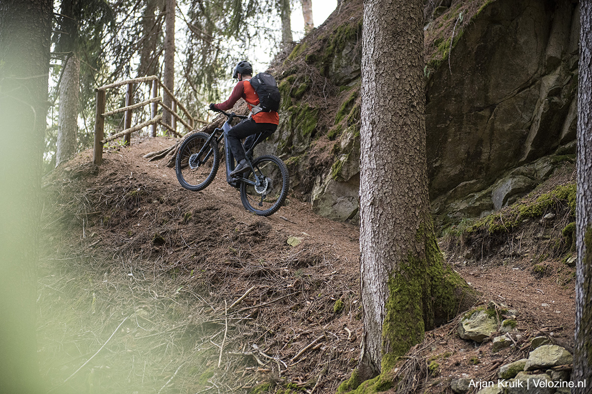 Dan het dalen. Dit is de discipline waarbij de Stereo Hybrid 140 HPC ABS me het meest verrast heeft, met name in hele steile en lastige secties met keien, wortels en rotsblokken, die je noodgedwongen op een relatief lage snelheid moet overmeesteren. Althans, die ík langzaam neem. Het hoge stuur dat ik in de beklimmingen nog lager wilde zetten, is hier helemaal op z’n plaats. In combinatie met de luie, lage en relatief lange geometrie rijd ik op de Cube secties naar beneden waar ik op een normale mountainbike echt wel drie keer over nagedacht zou hebben. De massa van deze hybride speelt daarbij natuurlijk ook een rol, maar ik geef zéker ook credits aan het anti-blokkeersysteem.