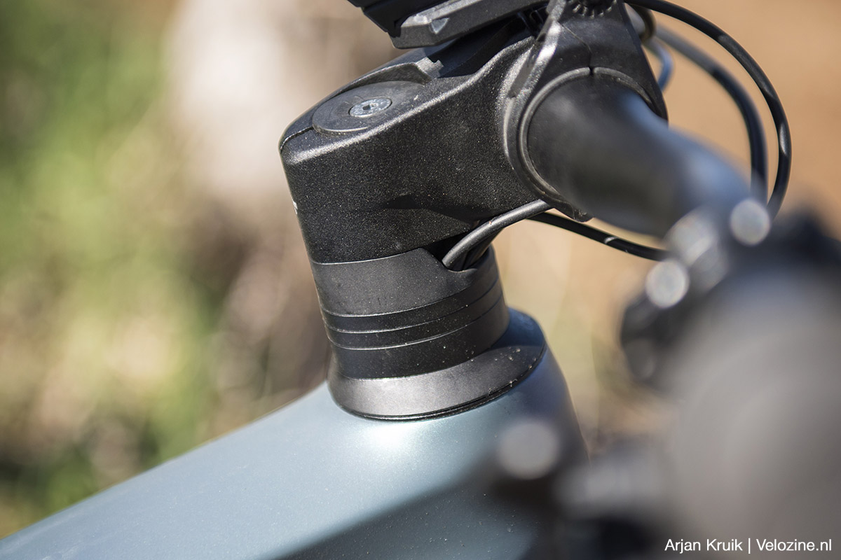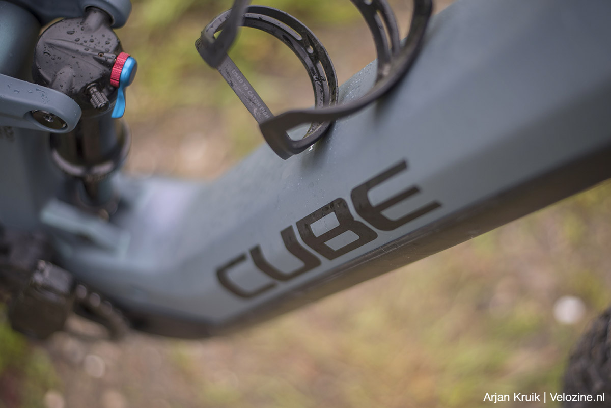 Dat laatste betekent dat je in steile beklimmingen over redelijk veel grip beschikt, ook al omdat de lange achtertrein de druk goed over beide wielen verdeelt. Fijn: krappe bochten omhoog neemt deze e-mountainbike van Cube zonder morren. Wel even opletten met keien of wortels, want vanwege de laag geplaatste trapas is de kans dat je met je pedaal de grond raakt niet ondenkbeeldig. Ander puntje is het hoog geplaatste stuur. Ik wil dat voor iets meer druk op het voorwiel graag wat lager zetten, maar omdat we tijdens de test geen passende vulringen bij de hand hebben, blijkt dat niet mogelijk. Mooi hoor, die kabeldoorvoer door het baldhoofdlager met speciale vulringen onder de stuurpen, maar niet heel praktisch. Tot slot: wordt het écht steil, dan laat de achterband me in de steek. Hier zou een zachtere rubbersamenstelling met meer grip mijn voorkeur hebben, het zou de klimeigenschappen echt verbeteren.