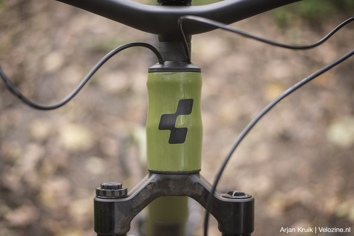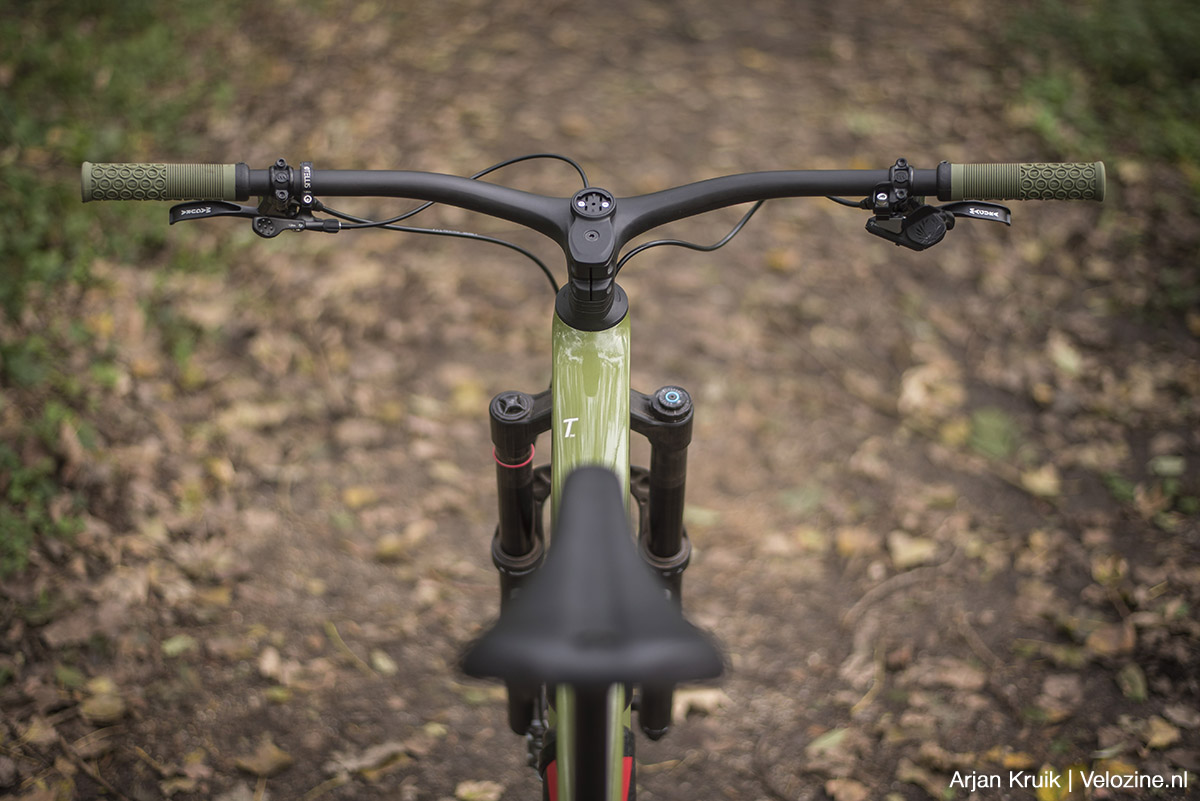 “Bijna”, want als deze Cube Stereo One55 TM mijn eigen bike was, dan zou ik een dropperpost met een groter verstelbereik monteren. Voor een bike als dit, met z’n steile zitbuishoek, is 150 millimeter eigenlijk te weinig. Daarnaast zou ik de zaag in het stuur zetten, 800 millimeter is te breed. Voor mij persoonlijk ligt de sweetspot rond 770 à 780 millimeter breedte en zeker niet meer. Maar goed, dat is wel een beetje spijkers op laag water zoeken, want de basis van de Stereo One55 TM staat als een huis.