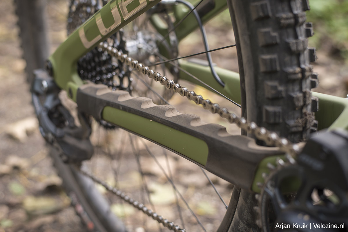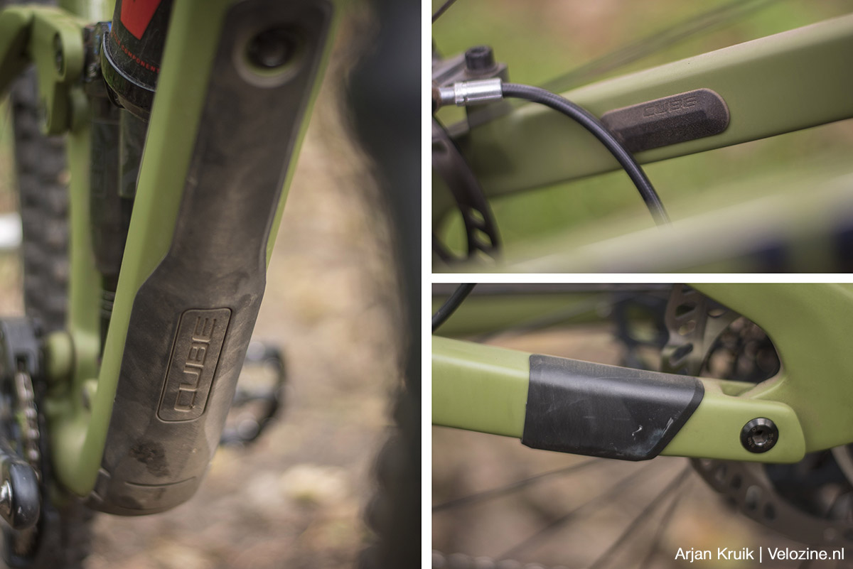 Maar ook dát is nog niet alles. Stonden Cube Stereo’s van de vorige generatie nou niet bepaald bekend om het uitbundige gebruik van framebeschermers, op de One55 is er juist geen plekje dat niét zorgvuldig beschermd is. “Als we het doen, dan doen we het goed”, moet iemand bij productontwikkeling gedacht hebben. Zo is de liggende achtervork aan weerszijden beschermd tegen langsschurende schoenen. Top!