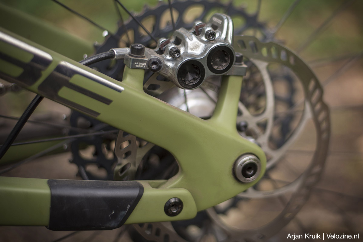 Ook lekker is de Tellis-dropperpost van SDG. Supersmeuïg, met een lichte bediening en zonder speling. Waren alle droppers maar zo. Punt van aandacht is misschien nog wel de achterste remschijf. Voor mijn vlieggewicht van zo’n 65 kilo is de gemonteerde 180 millimeter schijf groot genoeg, maar ik kan me voorstellen dat zwaardere rijders een grotere remschijf monteren.