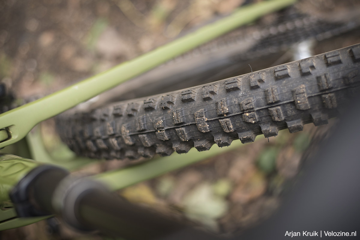 En dan zijn er nog de rubbers. Een Maxxis Minion DHR in 2.4 inch aan de achterkant en een Maxxis Assegai in 2.5 inch vooraan, beide met het stevige Exo+ karkas. Met name die voorband draagt in niet geringe mate bij aan de capaciteiten van de Stereo One55. Het gaat namelijk om de uitvoering met de Maxxgrip-rubbermix. Wat heeft die een grip op stenen en wortels! Als je dát eenmaal door hebt pak je in tricky secties niet meer de chickenline, maar ga je gewoon vol over de features heen. Want die band, die houdt het wel.