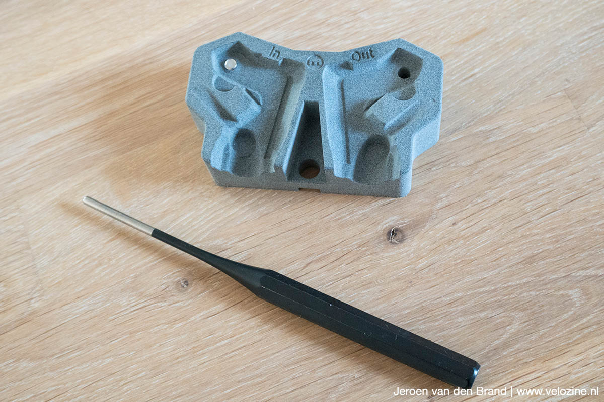 Nóg handiger is het om Magura’s specifieke tool te gebruiken. Magura leverde ons er één mee. Het is een 3D geprint kunststof blok, waar in beide helften exact het profiel van remgreep is aanbracht. De remgreep past hier perfect in en wordt zodoende goed ondersteund.