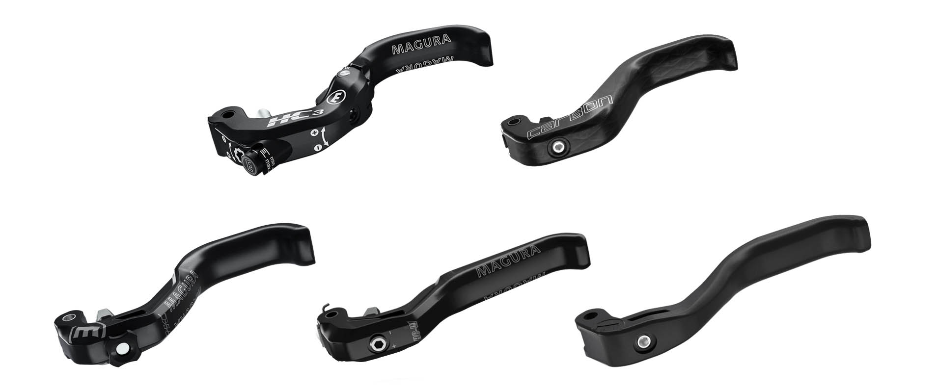 Bovenaan links bovenstaande foto zie je de uiterst verstelbare HC3 hendel waarbij je de ratio tussen knijp- en remkracht kunt verstellen. De vorm van de hendel is identiek aan de HC Carbon, rechts bovenaan. Deze twee hendels zijn alleen beschikbaar voor de remmen met Magura’s Carbotecture SL ‘masters’ (het vaste gedeelte van de remgreep) die je vindt bij de MT6 (inmiddels uitgefaseerd), MT8 (Pro en SL), MT7 Pro, en MT Trail carbon/SL vanaf 2015.