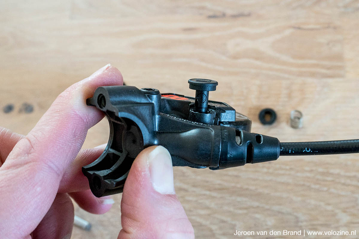 Bij de remmen met de Carbotecture SL master dien je eerst de BAT-plug te verwijderen. Dit is de kunststof pen die vastzit met een bajonet-moer met een veer er achter. Deze plug begrenst de slag van de remhendel en zorgt er voor dat ‘ie spelingsvrij in de master zit. Bij de eerste generatie van deze MT-serie was dit een verstellingselement. Samen met de reikwijdteverstelling kon je zo het aangrijppunt van de remmen verstellen. ‘BAT’ staat dan ook voor ‘Bite Adjustment Technology’. Heel veel verstelling gaf ‘ie – ondanks een redelijke draaislag – niet. Tegenwoordig zit er dan ook standaard een niet-verstelbare versie in. Dat gezegd hebbende; er zijn nog steeds wél verstelbare versies aftermarket van Magura te koop bij diverse onlineshops.