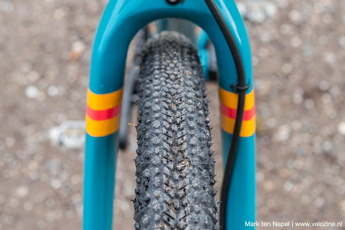 Inmiddels rijdt hij al heel wat kilometers met de X’Plor MSO gravelbanden van Donnelly. Fijn genopt, relatief licht lopend en slijtvast.