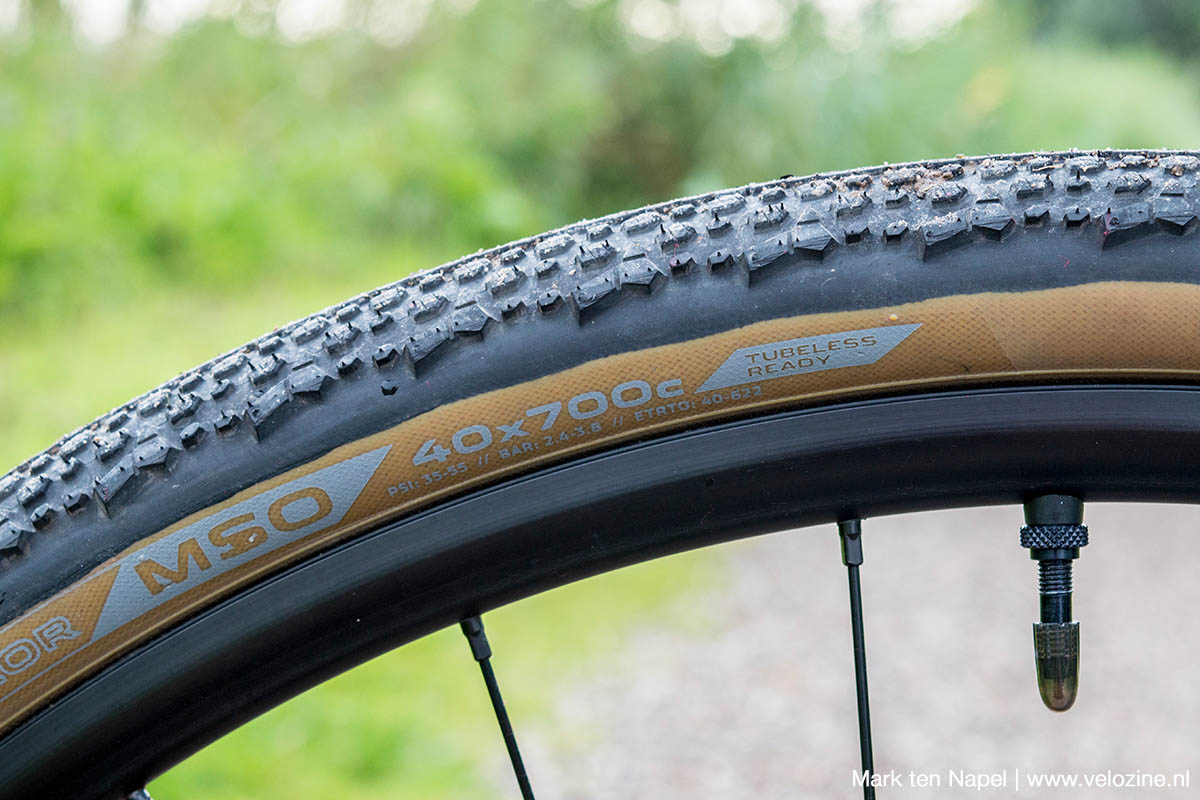 Het 120 tpi karkas is redelijk soepel en is, zoals je kunt zien, licht gekleurd. Donnelly noemt het ‘tanwall’. Anderen noemen het skinwalls, transparant… Ik noem het eerder ‘Caramel Latte Macciato’. Want toen ik onlangs koffie zat te drinken met mijn dochter in een lokaal koffietentje, kwam de kleur van de Macciato die zij voor haar neus had staan nog het beste overeen. Heb je je banden het liefst zoals ik mijn koffie drink, dan is het goed om te weten dat Donnelly de X’Plor MSO gravelbanden ook geheel in het zwart levert.