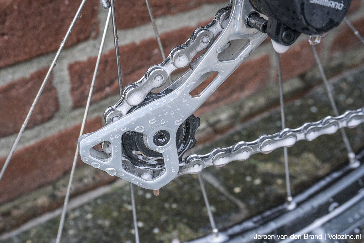 Met de inweektijd van een minuut of drie in acht genomen, moet er alsnog geboend worden. Ik gebruik hiervoor altijd een oude afwasborstel. En ja, bij de kettingen met de op was gebaseerde smeermiddelen, ben ik vrij snel klaar. Op de testfiets hier in beeld moest ik beduidend meer boenen. De herinnering aan de dagen dat ik nog geen kettingwas toepaste kwamen weer boven borrelen, gecombineerd met het subtiele geurtje dat Drivetrain Detox afgeeft. Na het boenen en afspoelen met water laat de detoxbeurt geen residu achter.