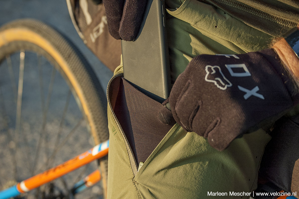 Nog even terugkomen op die gaasstof zakjes; die vind je dus – toch wel bijzonder – op de lenden. Daar kun je dan een extra voorraad energierepen meenemen. Heel veel meer moet je – met oog op een valpartij – ook écht niet willen. Op de pijpen zijn óók gaasstof zakken voorzien. Links opgedeeld in twee compactere zakken voor wederom energierepen, rechts groot genoeg voor je telefoon. De openingen in de pijpen van de GV500 Foyle Short geven je precies toegang tot deze zakken. Voor mij was de rechterzak dan ook dé plek om mijn telefoon mee te nemen. Die zit vervolgens strak en dus veilig opgeborgen, en echt opmerken tijdens het trappen deed ik hem nooit.