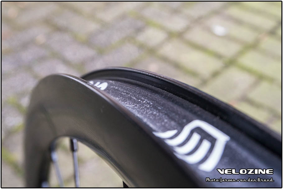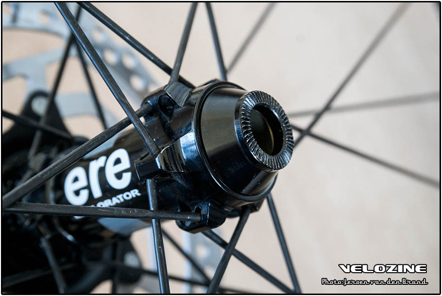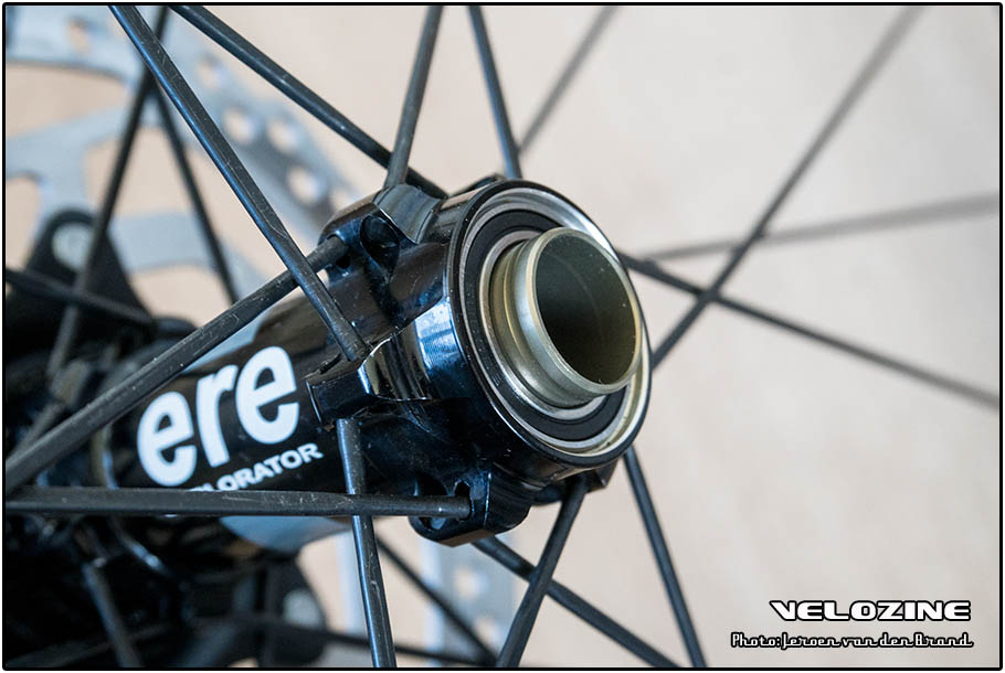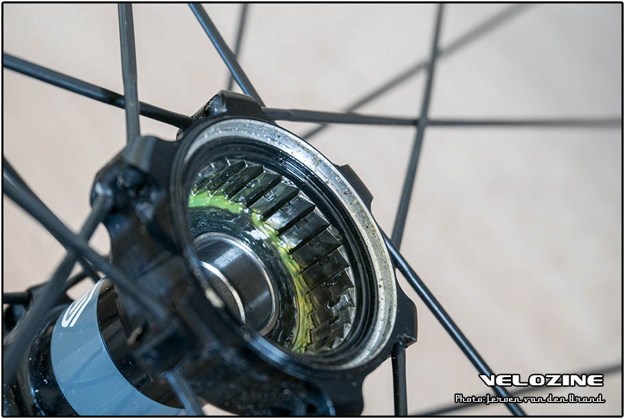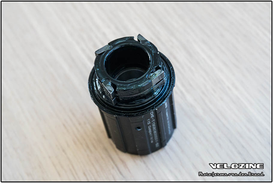 Onze wielset kwam met een vrijloop met de standaard Shimano HG cassette-passing. Sram XDr of Campagnolo opties zijn óók verkrijgbaar. Tussen de vrijloop en de naafhuls is een rubber afdichting aangebracht. Prima om troep weg te houden bij de vier vrijlooppallen. De dichting zit alleen wat verdiept ín de naafhuls en op een kleinere diameter. De vrijloop valt met zijn buitendiameter een stukje ín de naafhuls en precies in de rand tussen de naafhuls en de afdichting merkte ik bij een inspectie dat er wat zand in deze rand gekropen was. Met de cassette gedemonteerd, was een licht knarsend geluid te horen (los van het ratelen van de vrijlooppallen). Functioneel vooralsnog geen probleem, maar op den duur wél een potentieel aandachtspunt om de wielset het boterzachte-karakter te laten behouden…