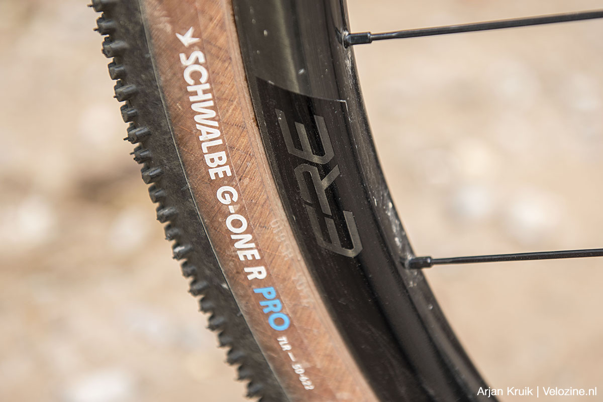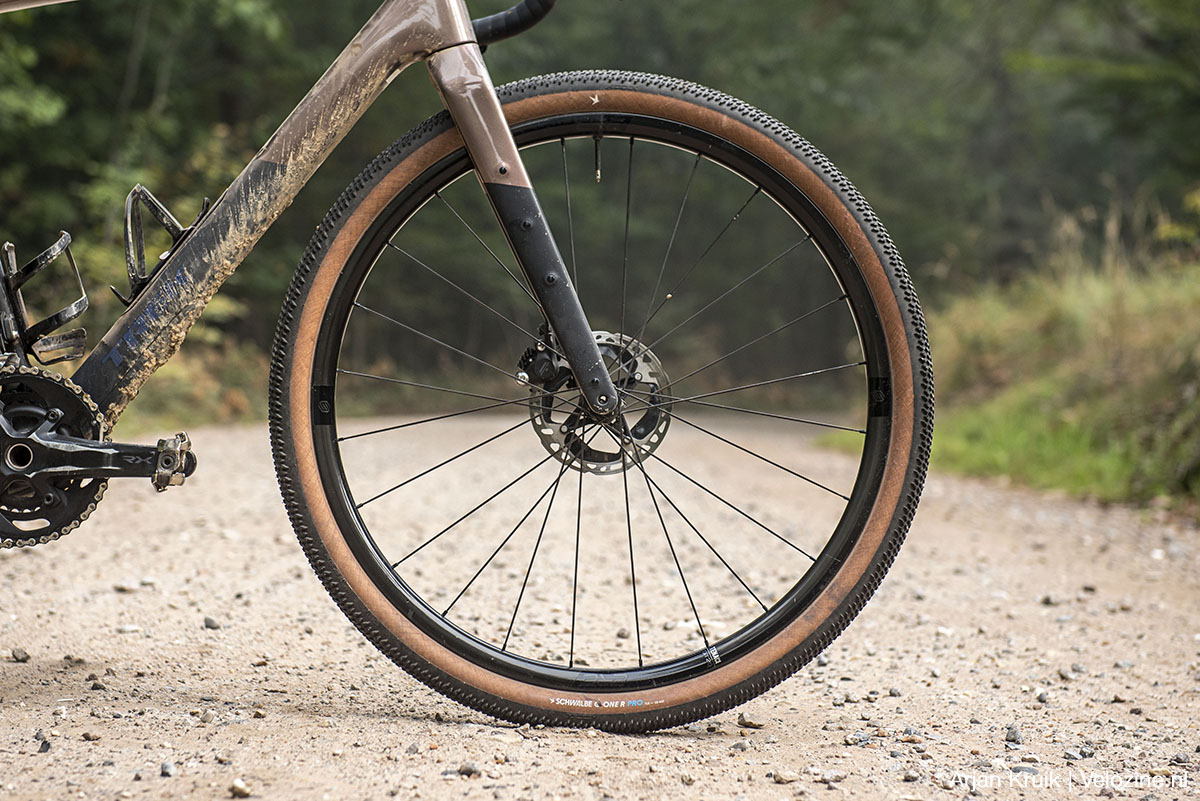 De reden: ik ben met die brede G-One R en G-One RS snéller dan met de smallere, veertig millimeter uitvoeringen van dezelfde banden. In combinatie met de Tenaci GA25’s heb ik met die brede rubbers zowel in het bos áls op asfalt verschillende PR’s gereden. Who needs aero? Voor de liefhebbers van data: op onverharde wegen en paden met een druk van 1,2 bar voor en 1,3 bar achter, op asfalt 1,7 bar voor en 1,8 bar achter. En vergeet daarbij niet dat de combi van de Tenaci GA25 en de vijftig millimeter G-One behalve sneller tevens gripvaster en comfortabeler is. Win win win.