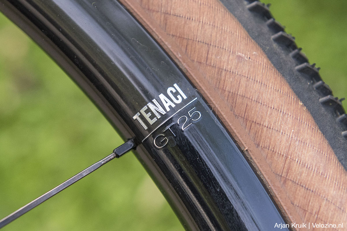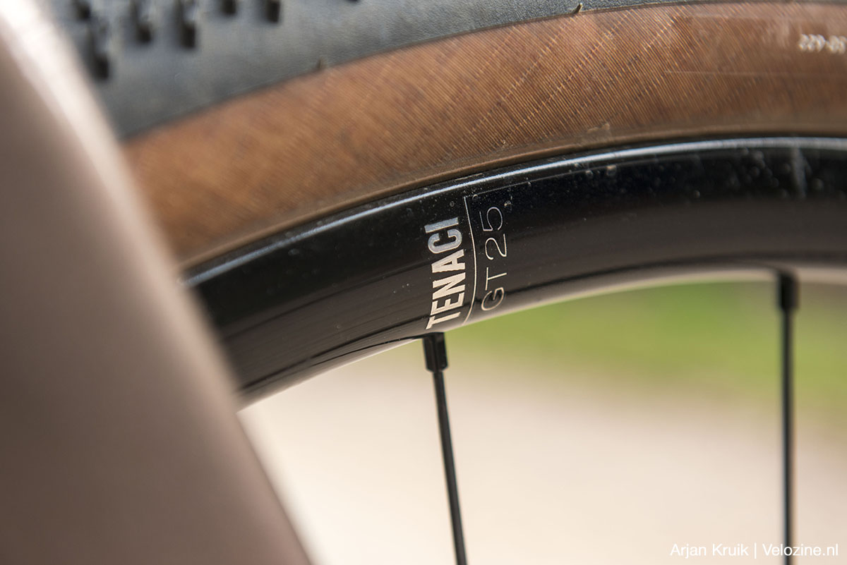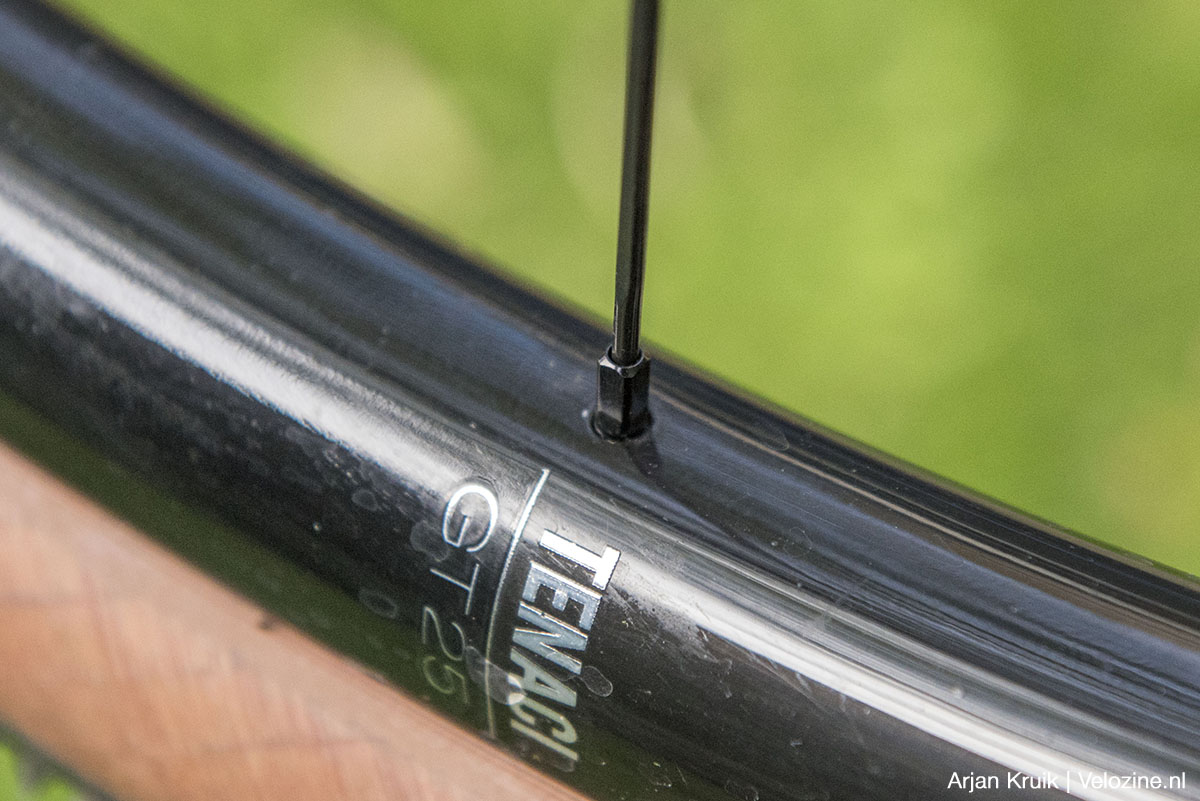 Met 1.554 gram zijn de Tenaci GT25’s lekker licht en kom je snel op gang. Maar echt euforisch, zoals bij sommige ultralichte gravelwielsets, is de acceleratiebeleving niet. Ook als het gaat om sturen doen deze Hollandse hoepels nauwkeurig en zonder nukken hun ding. De stijfheid lijkt in orde. Althans, als ik die op mijzelf betrek, met mijn gewicht van nog geen tachtig kilo. Ik heb ik geen moment het idee gehad dat de wielen overdreven vervormen bij stevig aanzetten of hard insturen. Ook qua sterkte valt er niets op de wielen aan te merken. Alhoewel ik toch regelmatig een wortel zó hard geraakt heb dat deze met een luide kloenk tegen de velg klapte, is er geen schade. Niet aan de velg, niet aan het wiel als geheel en óók niet aan de band.