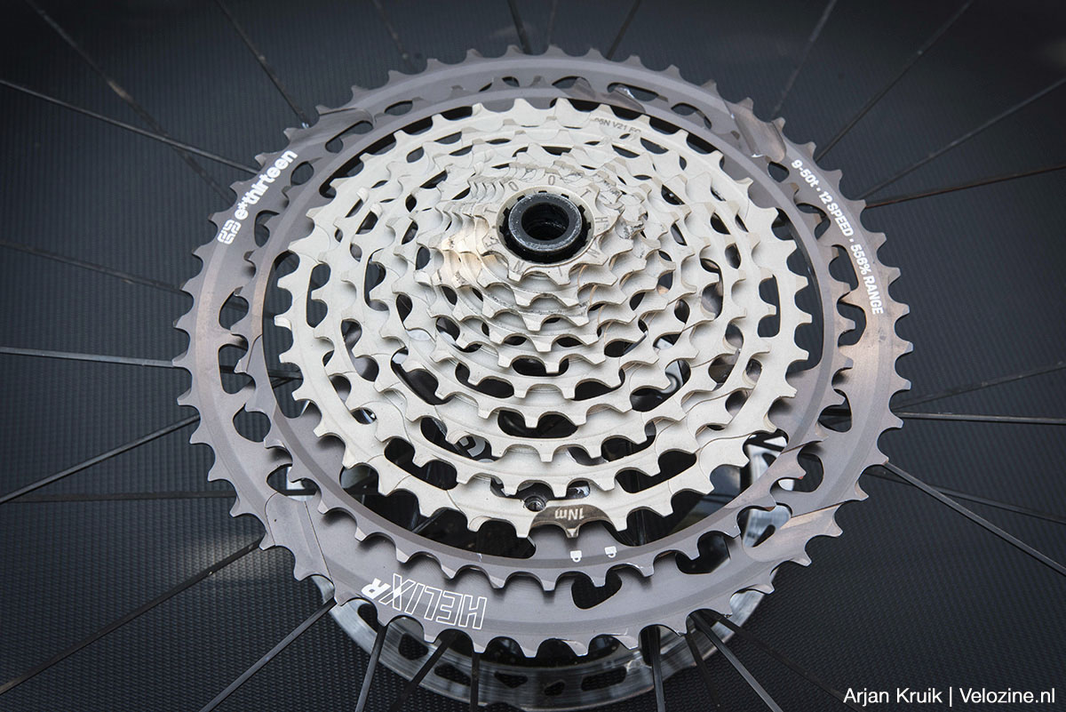 Maar ook op de weegschaal is de Helix R12 concurrerend; e*thirteen claimt 345 gram. Dat is 31 gram minder dan een Shimano XTR 10-51 cassette en 32 gram minder dan een Sram XX1 10-52 cassette. Terwijl het bereik juist groter is: 556 procent voor de Helix R12 versus 510 procent en 520 procent voor Shimano en Sram. Dat grote bereik realiseert e*thirteen niet door een nóg grotere binnenkrans toe te passen, maar juist door een kléiner buitenkransje te gebruiken. Dus geen 10-tands kransje, zoals Shimano en Sram, maar eentje met maar 9 tanden.