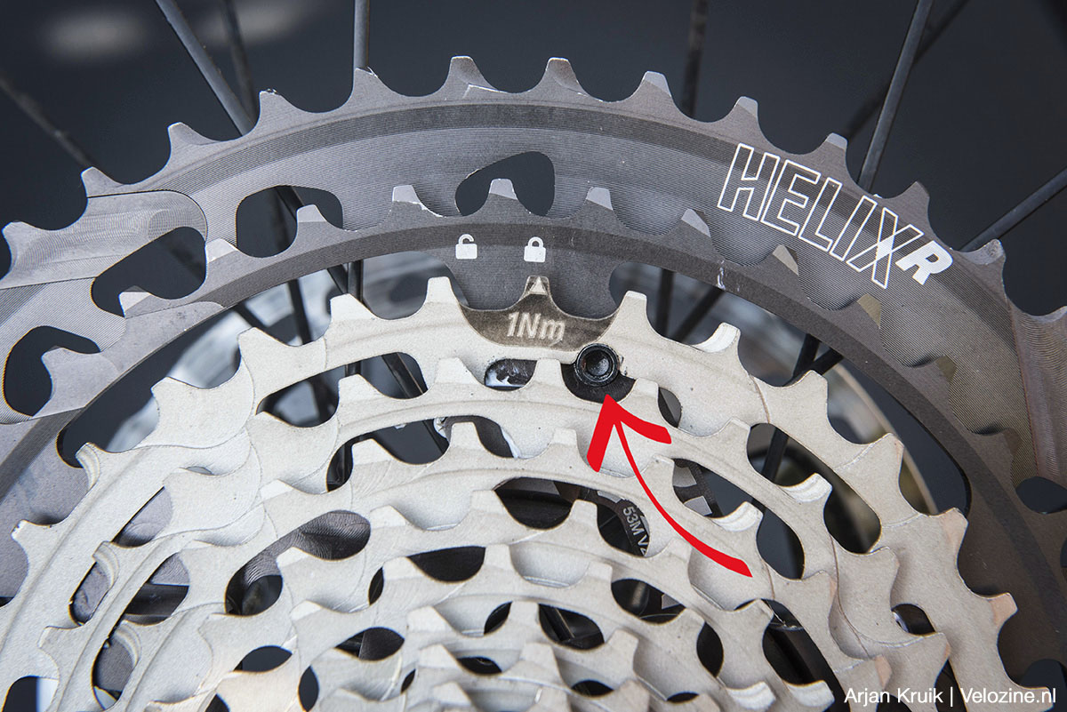 Het monteren van de Helix R12-cassette is appeltje eitje. De uit één stuk aluminium gefreesde grootste twee kransen schuif je over de body, waarna je deze cluster met een inbusboutje fixeert. Vervolgens plaats je de uit één stuk staal gefreesde rest van de kransen op de body. Vanwege de kunststof bus tussen de body en de cassette moet je die de eerste keer flink stevig aandrukken; daarbij is een paar werkhandschoenen geen overbodige luxe. Zit ook het stalen deel van de cassette op de vrijloop, dan draai je dat met een kettingzweep een klein stukje met de klok mee, zodat de haken aan het stalen deel kunnen aangrijpen in de gleuven in het aluminium gedeelte. Tot slot nog even het borgboutje aandraaien en je kunt het bos in.