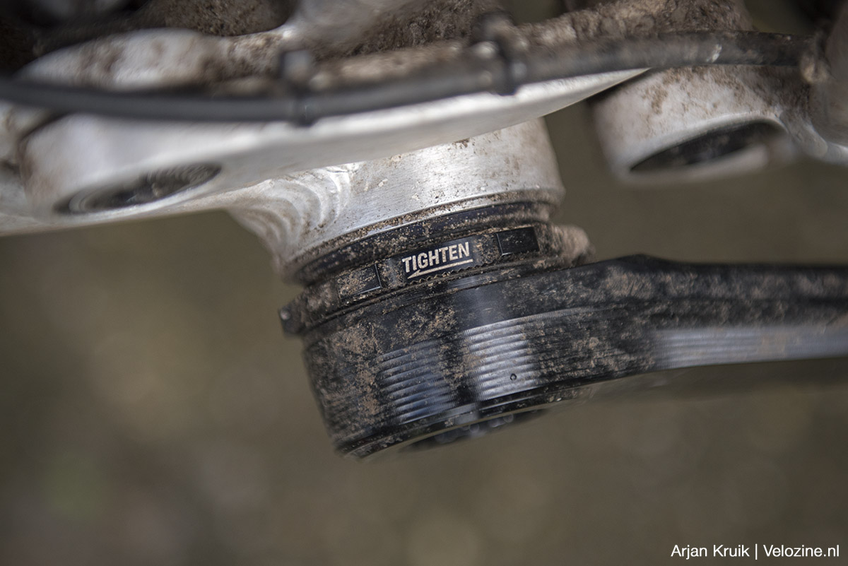 Ook de aluminium Helix Race-crank zijn allesbehalve dertien in een dozijn. Ze zijn eerst gesmeed en vervolgens verder in vorm gefreesd. Deze combinatie van productietechnieken geeft de cranks niet alleen een onderscheidend uiterlijk, maar levert ook een redelijk laag gewicht op: 568 gram bij een cranklengte van 170 millimeter. Niet slecht, maar toch 100 gram zwaarder dan mijn eigen cranks van dienst, de aluminium Kapics van het Spaanse Rotor. De Helix Race-crankset, die voorzien is van een 30 millimeter as, faciliteert directe montage van kettingbladen. De crank is aan de niet-aandrijfkant vast verbonden met de as. Aan de aandrijfkant wordt de as met een bout aan de as bevestigd. Deze bout dubbelt als crankpully.