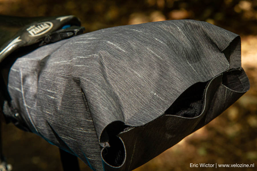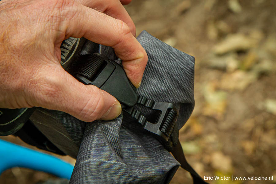 Deze tas sluit aan het open einde door middel van een paar stukken klittenband. Daarna is het een kwestie van strak oprollen en de borgende lus er eveneens strak omheen trekken. Het sluiten van de lus moet je overigen wél met twee handen doen. Andersom: zo maar openschieten is er óók niet bij. Voor waterdichtheid is het wel zaak de tas zó te vullen (en rollen) dat eventuele kieren in het open einde natuurlijk niet richting regen of spray van het achterwiel wijzen.