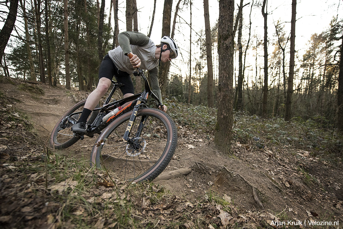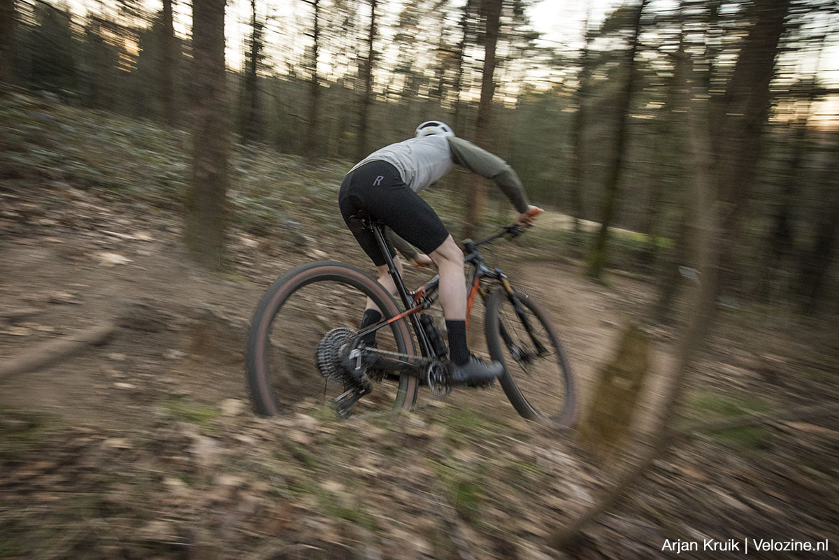 Voor de eerste rit met de 34 SL heb ik de luchtdruk en de rebound conform de richtlijnen van Fox afgesteld. Dat blijkt prima. Al in het eerste rondje etaleert de nieuwe Fox namelijk al z’n kwaliteiten. In het eerste van de vele korte klimmetje die Kwintelooijen kenmerken, weet het voorwiel de ondergrond zeer goed te volgen. Iéder kiezeltje wordt geabsorbeerd, óók in de steilste secties, als er maar weinig druk op het voorwiel staat. Maar tegen m’n verwachtingen in heeft deze eigenschap geen repercussies in de afdaling die daarop volgt.