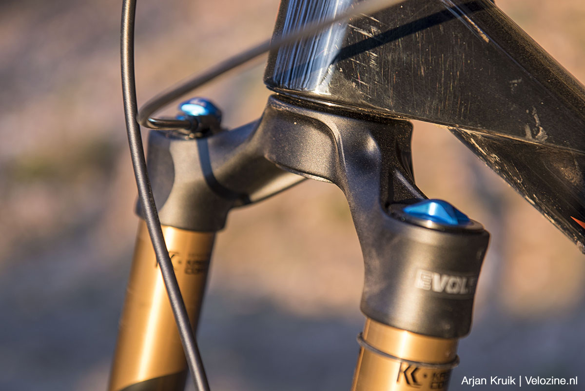 Goed, tot zover mijn bedenkingen. Til er niet te zwaar aan, want er valt namelijk veel goeds te melden. Sterker: op papier overtreft de Fox 34 SL z’n voorganger op alle punten. Ik noemde de grotere luchtkamers al, waarbij met name het extra volume in de negatieve luchtkamer zou moeten zorgen voor soepeler aanspreken. De verder uit elkaar staande vorkpoten en de nieuwe brug bieden ruimte aan bredere banden, met als bonus een toegenomen torsiestijfheid. Ook de nieuwe kroon – nu van extreem bewerkt 7000 aluminium – zou stijver zijn dan de oude. Een dan is er ook nog de vergrote afstand tussen de glijlagers in de vorkpoten, want eveneens een positieve invloed heeft op de stijfheid.
