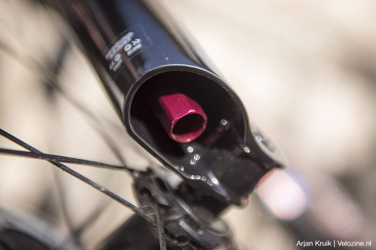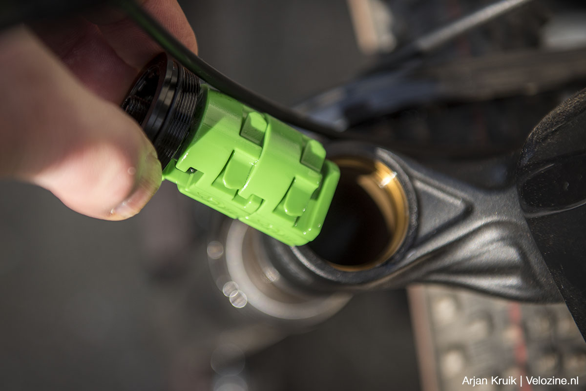 Afhankelijk van je gewicht, je rijstijl en het terrein kun je met die twee vulbussen als uitgangspunt alle kanten op, maar ik heb zelf geen spacers toegevoegd of uitgenomen. In combinatie met de effectieve demping van de ingaande slag is de vering in de fabrieksafstelling bij mijn gewicht van een kilo of 75 namelijk progressief genoeg. Het verder verkleinen van het luchtvolume is dus niet nodig. Vergroten overigens ook niet, alhoewel een beetje met het volume te experimenteren natuurlijk altijd interessant is.
