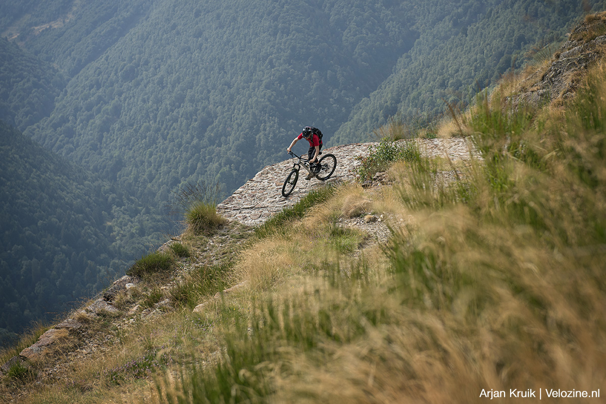 Een paar dagen later pakken we een route naar de San Jorio, de op 2.012 meter hoogte gelegen pas die de grens tussen Italië en Zwitserland markeert. Sommige secties over gras, dan weer over losse aarde, steengruis, losliggende, vuistdikke keien, nog grotere keien. Kortom, ook hier is niet alleen pure remkracht van belang, maar tevens een goede doseerbaarheid. Maar tijdens deze toch wel extreem lange afdaling laten de Code’s met Galfer remblokken en remschijven me niet in de steek. Ze leveren brute remkracht waar nodig, zonder dat die ten kost gaat van de doseerbaarheid. En ook zonder storende geluidsproductie. Overigens, voordat ik deze kwaliteiten volledig op het conto van de nieuwe remblokken en remschijven gooi; de Code-vierzuigerremmen van Sram staan sowieso bekend om hun zeer goede modulatie. Maar met de nieuwe set-up komt die toch op een nog hoger niveau te staan.