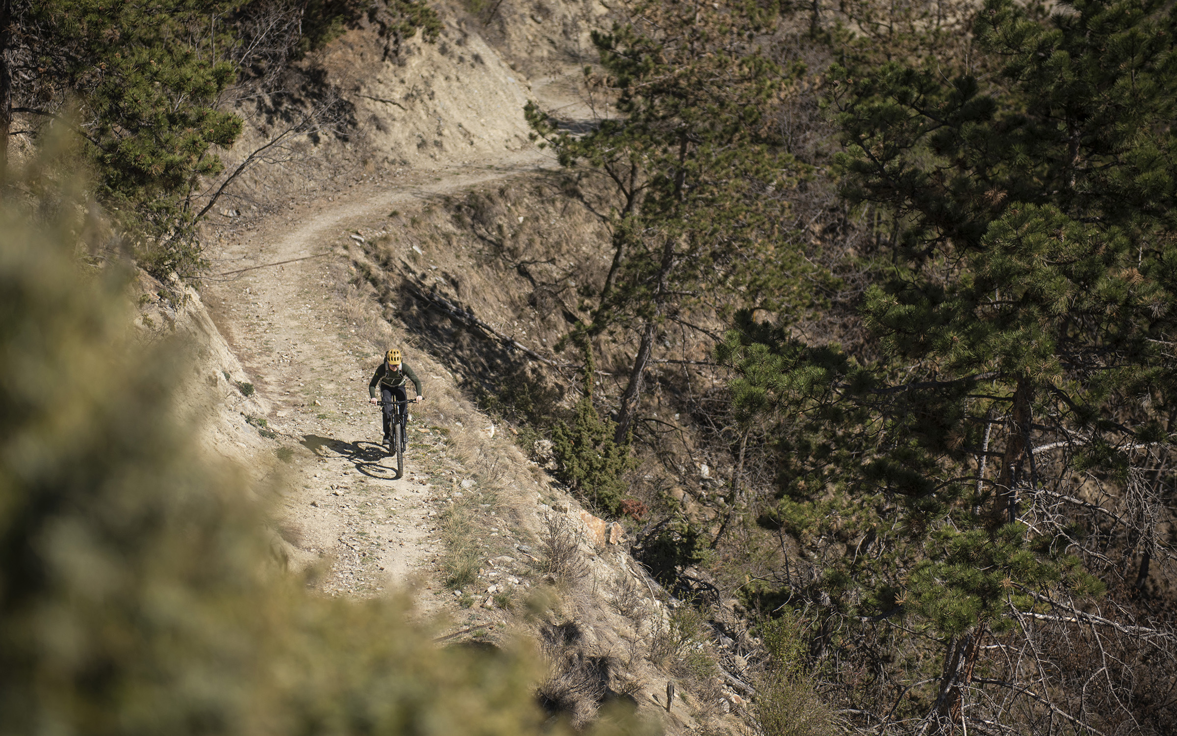 Dan het dalen. Hier stijgt de Trance 2 echt boven zichzelf uit. Zelden heb ik met een bike met deze hoeveelheid veerweg gereden die zo ontzettend goed afdaalt. Wat is deze Giant fijn in balans en wat is de vering capabel. En het gewicht dan? Dat is geen probleem als de zwaartekracht de goede kant op werkt. Nadat ik de toch niet bepaald gematigde Propain-trail met twee vingers in m’n neus ben afgedaald, is het daarna de beurt aan de nog veel lastigere Montesole-trail. Had ik daar afgelopen najaar m’n handen vol aan een Fuel EX, de op papier minder capabele Trance doet het op deze steile en ruige trail niet eens zo heel veel slechter. Het is echt verbazingwekkend waartoe een bike met zo weinig veerweg in staat is. Zo zie je maar weer; bij vering gaat het niet alleen om de kwantiteit, maar ook om de kwaliteit.