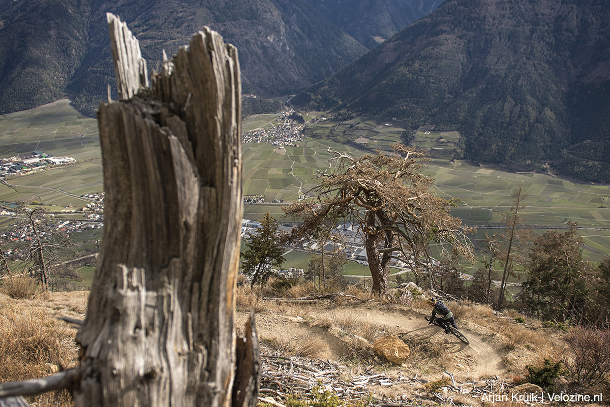 We rijden met de Giant op een van mijn favoriete bikespots: de Zuid-Tiroolse Vinschgau. Aangezien de meeste trails daar alleen op spierkracht bereikbaar zijn, moet een bike niet alleen goed kunnen dalen, maar ook goed klimmen. Het overgewicht van de Trance 2 blijkt minder een nadeel dan verwacht; in de lange maar gelijkmatige beklimmingen over asfalt en grindwegen is het gewicht minder van belang dan de zitpositie, de efficiëntie van de vering en de rolweerstand van de banden.