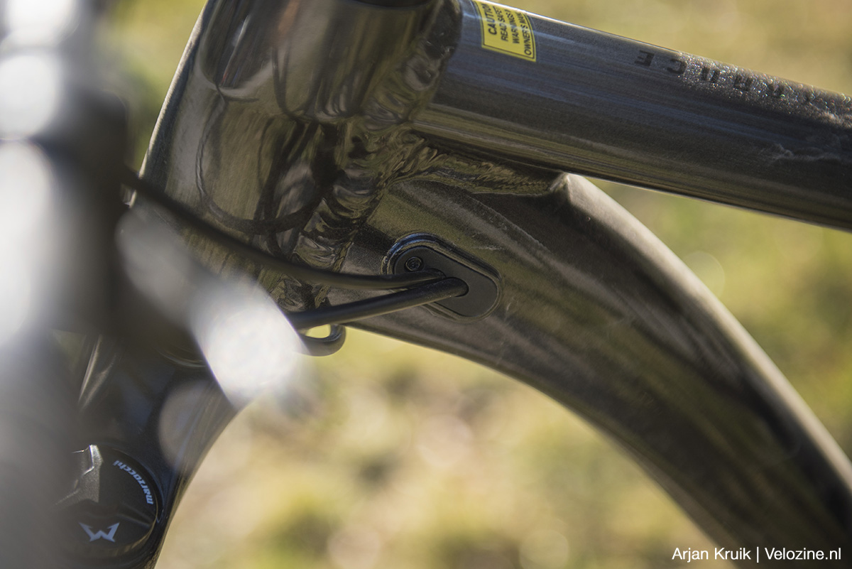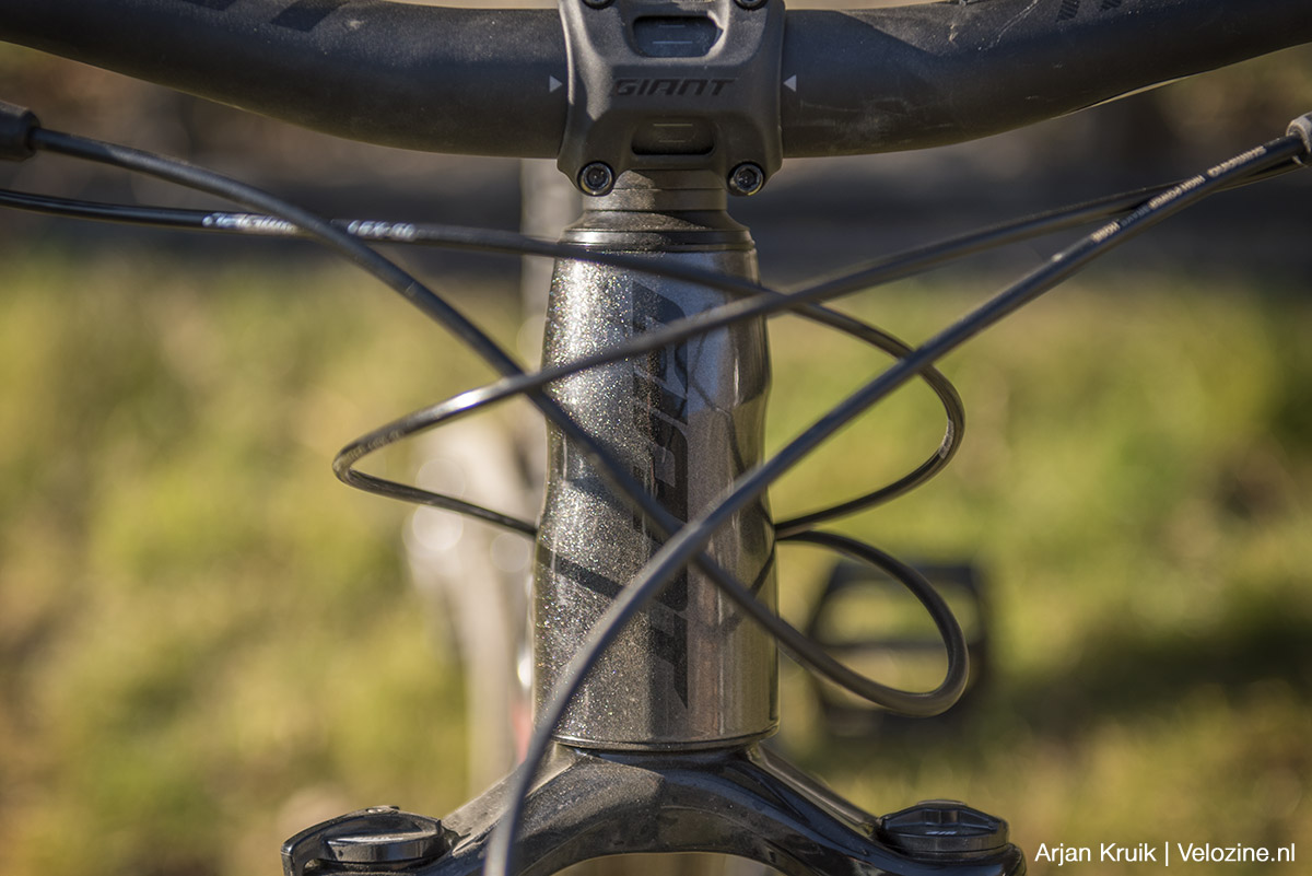 En dan is er natuurlijk nog het laswerk zelf, met strakke, regelmatige lasrupsen. Bijna jammer dat er een dikke laag lak overheen zit. Aan de andere kant, het is wél een strak lakje; een combinatie van zwart en donkergrijs met onder de blanke afdeklak minuscule metaalsnippers die, als het zonnetje er op de juiste manier op valt, oplichten in alle kleuren van de regenboog. Fraai! Ook de rest van de fiets is netjes. De kabels lopen rammelvrij binnendoor, waarbij met name de loop van de dropperkabel props verdient. Giant heeft namelijk extra ruimte rondom de trapas gecreëerd, waardoor de dropperkabel hier geen scherpe knik hoeft te maken. Een soepele kabelloop is hiermee gegarandeerd. Prima beschermers onderop de onderbuis en op de liggende achtervork maken het verzorgde totaalplaatje compleet.