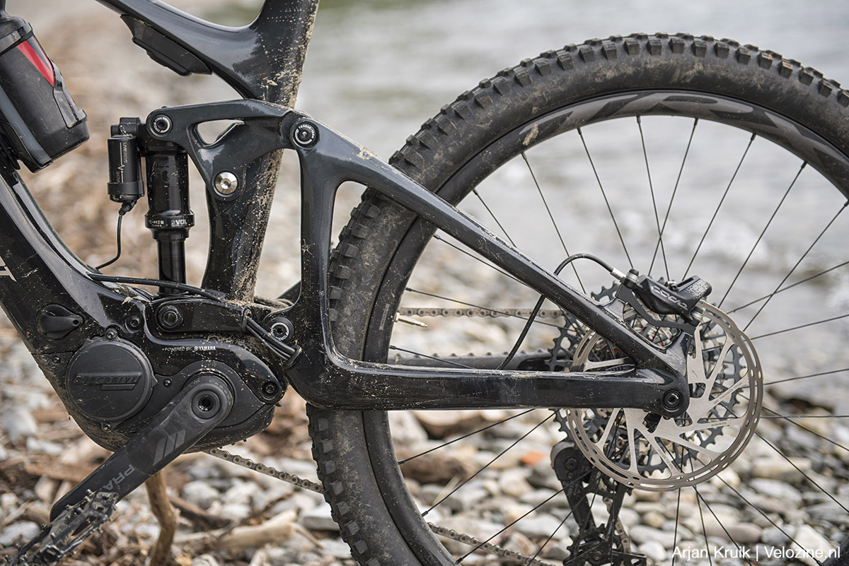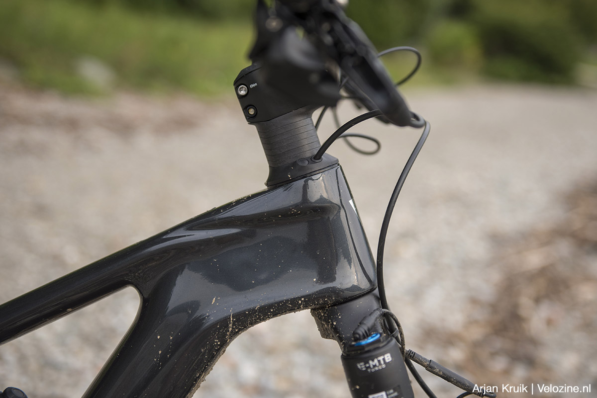 De achterbrug meet 447 millimeter. Voor een gewone mountainbike is dat aan de lange kant, maar voor een e-mountainbike niet. Sterker: het is zó kort, dat er in de achterbrug uitsluitend plaats is voor een kleiner 27.5 inch achterwiel. De balhoofdbuis is eveneens opvallend kort: slechts 100 millimeter in onze testmaat M! Die hoge stapel vulringen zit dus niet helemaal voor niets onder de stuurpen; geheel zónder vulringen zou de zithouding wel heel erg diep en gestrekt zijn.