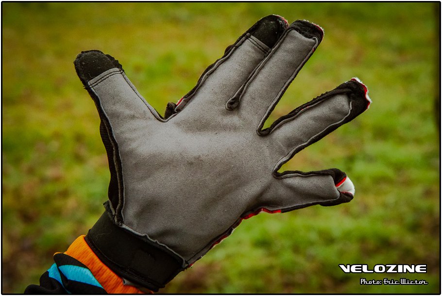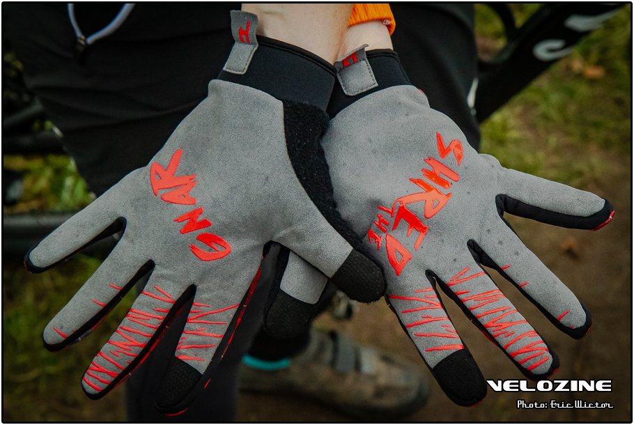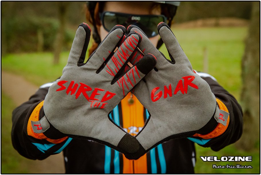 Op de handpalmzijde van de handschoenen staat te tekst “Shred the Gnar” zodat je deze motiverende spreuk niet hoeft te roepen naar je tegenliggers maar enkel je hand hoeft op te steken… De stof met opdruk geeft goede grip op het stuur. Er is bovendien genoeg ruimte tussen duim en wijsvingers om goed bij shifters te kunnen. Beide topjes van duim en wijsvingers zijn touchscreen compatible, wat handig is als je onderweg op je Garmin de route aan het zoeken bent en/of wilt bellen omdat je wat later thuis komt.