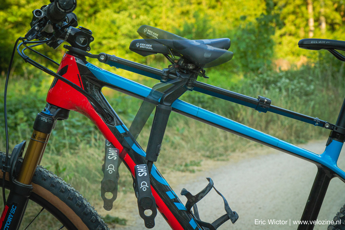 De meeste ouders kennen ‘m wel: de zadel-op-stang constructie waarmee je zowat iedere willekeurige stadsfiets voorziet van een voorzitje. Heel kort door de bocht is de Kids Ride Shotgun Pro iets soortgelijks, maar dan voor op de mountainbike: een zitje dat je op je bovenbuis (of hulpstang) plaatst. Voeg er toe-clips en een klein, verhoogd stuurtje aan toe en je minibiker kan lekker mee rijden terwijl pa of ma zich wezenloos trapt.